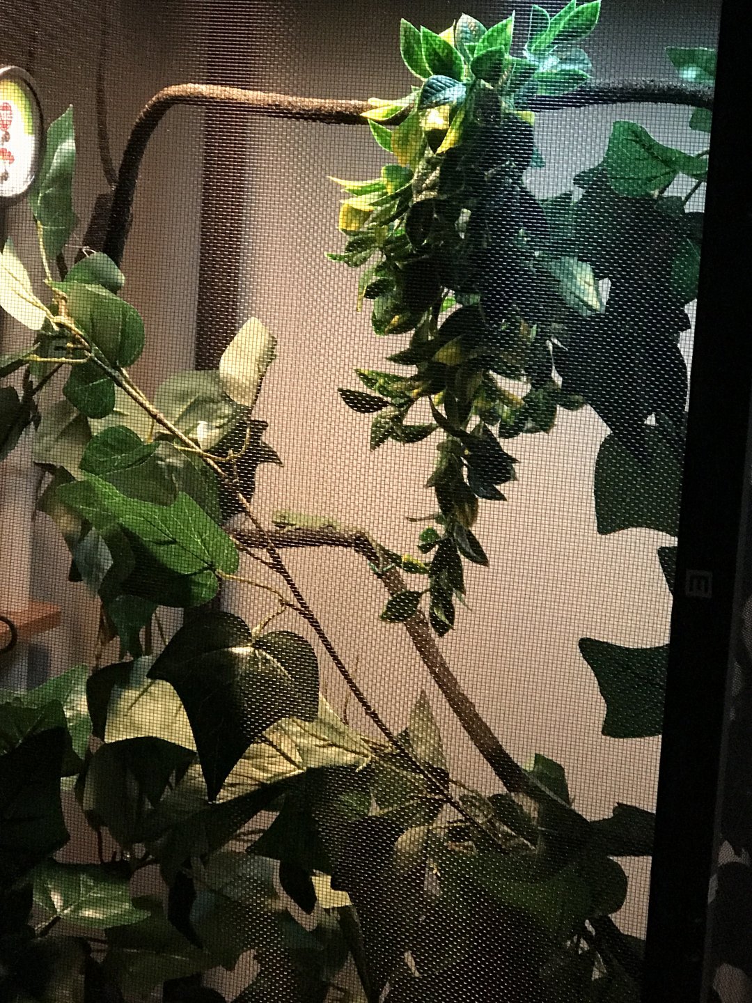 Finally came down, his top branch is higher so he can get enough warmth and uvb. I still have to buy the plants and more vines.