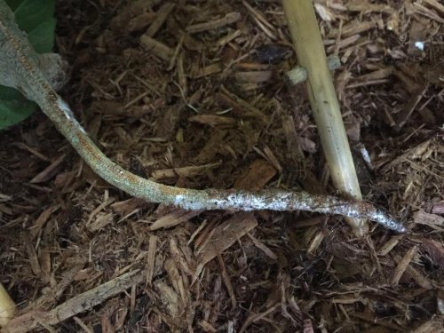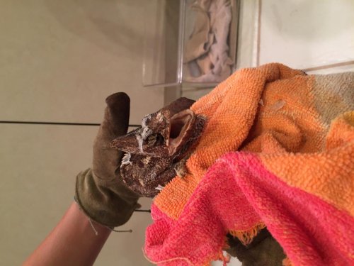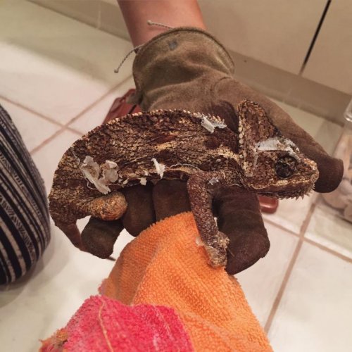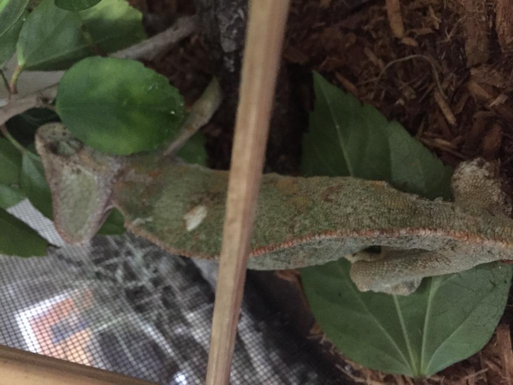 Background: I live in Southwest Florida and my sister spotted this smallish chameleon on the fence on a vine in our backyard and noticed it was missing a back leg and looking very rough. Since they're not native and he/she looked like they were struggling and I already have experience with chameleons I caught it with a towel and have had it in my older chameleon's previous cage ever since (by itself). The cage is a 2x1 glass zoomed cage and was cleaned out before I put the new little dude in there. No chemicals were used to clean the cage. I set up the cage with coconut fiber medium, branches, and ficus leaves and branches with a heat(uva) and ubv dome lamp.