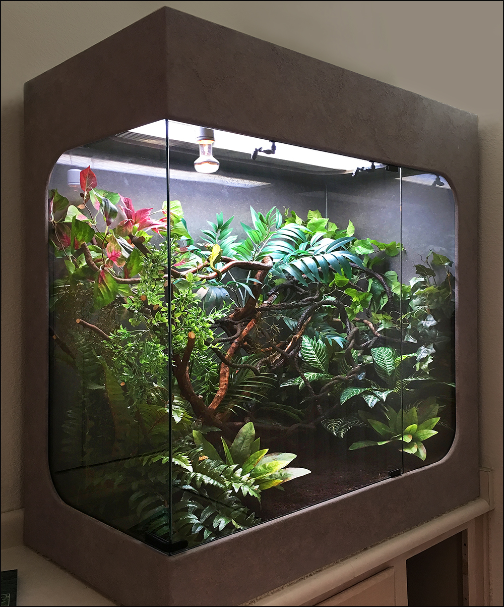 For ventilation (both enclosures) 3/4 of the top is "screen" and there is a small computer fan drawing air out above the basking lights. There is also a 1/4" gap along the bottom of the front glass door which allows air to enter. This might not seem like much but it's equal to a 3" x 3" hole on the Verrucosus enclosure and approx. a 2.75 x 2.75 hole on the Jackson's cage which actually allows quite a bit of air to enter especially with the fans and the chimney effect of the heat lights. It is the perfect balance allowing me to maintain some humidity in very dry Arizona while still allowing air flow.