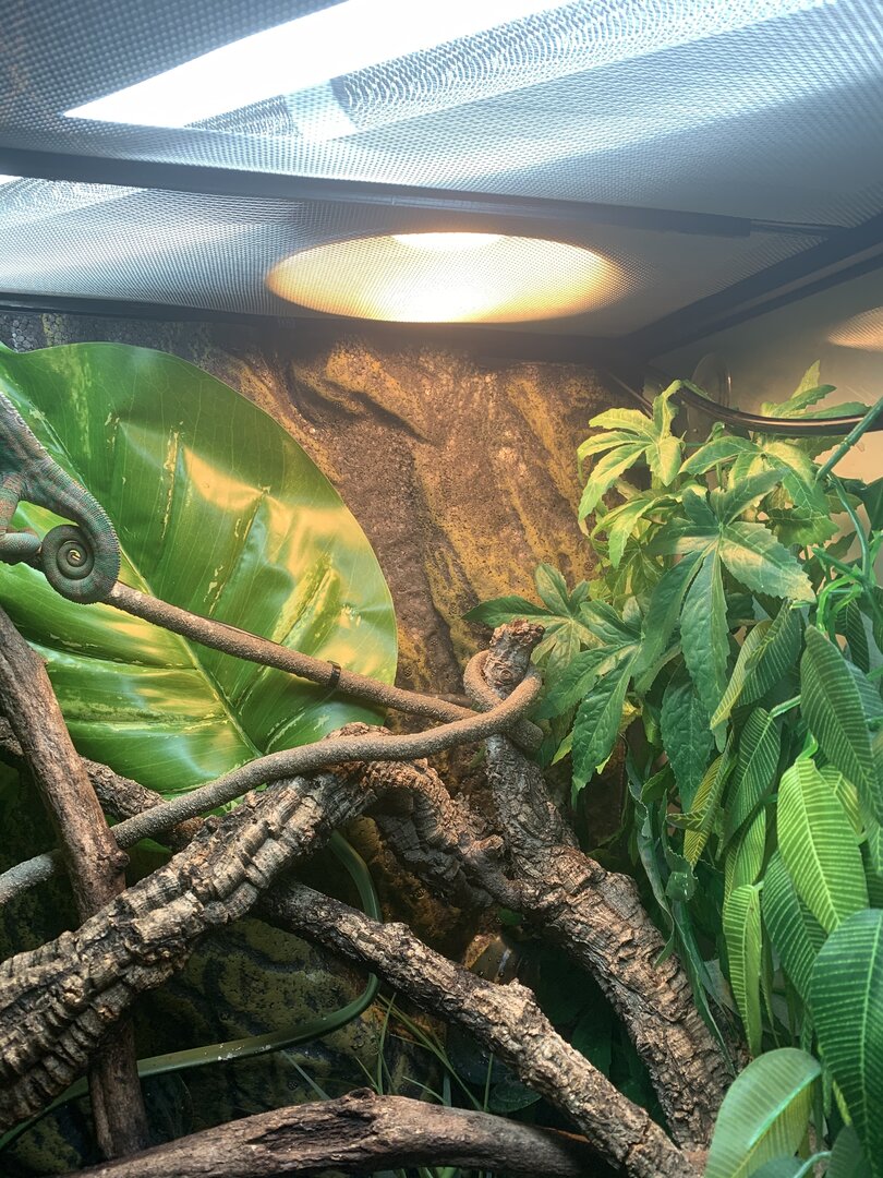 Thank you, I have moved my basking spot to the other side and he want be able to reach it.that is way too close, he can easily touch it. The chameleon should not be able to touch it. They can't feel it when they get burned, so they just burn their casques off.