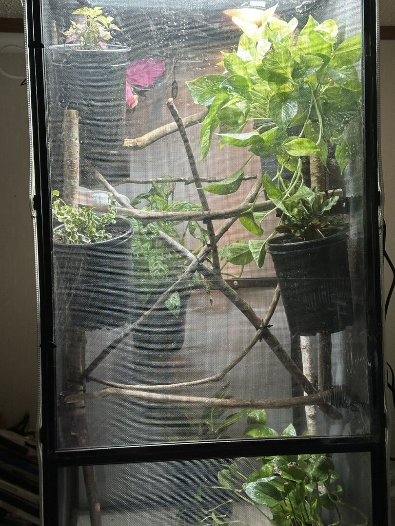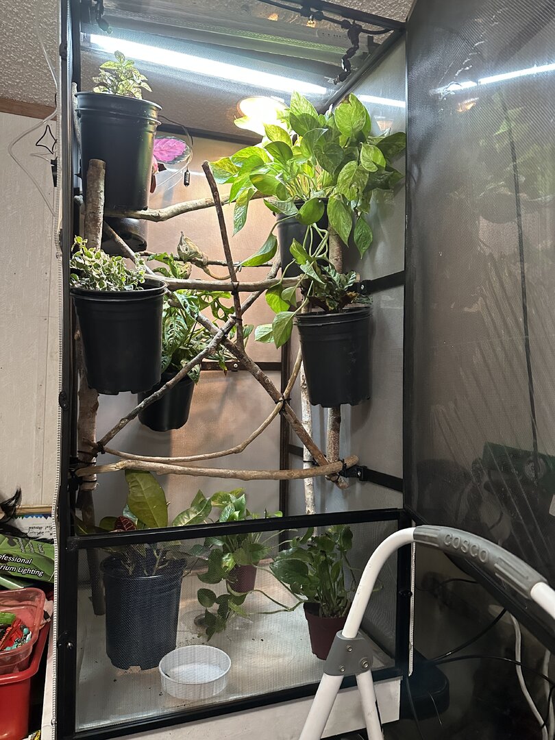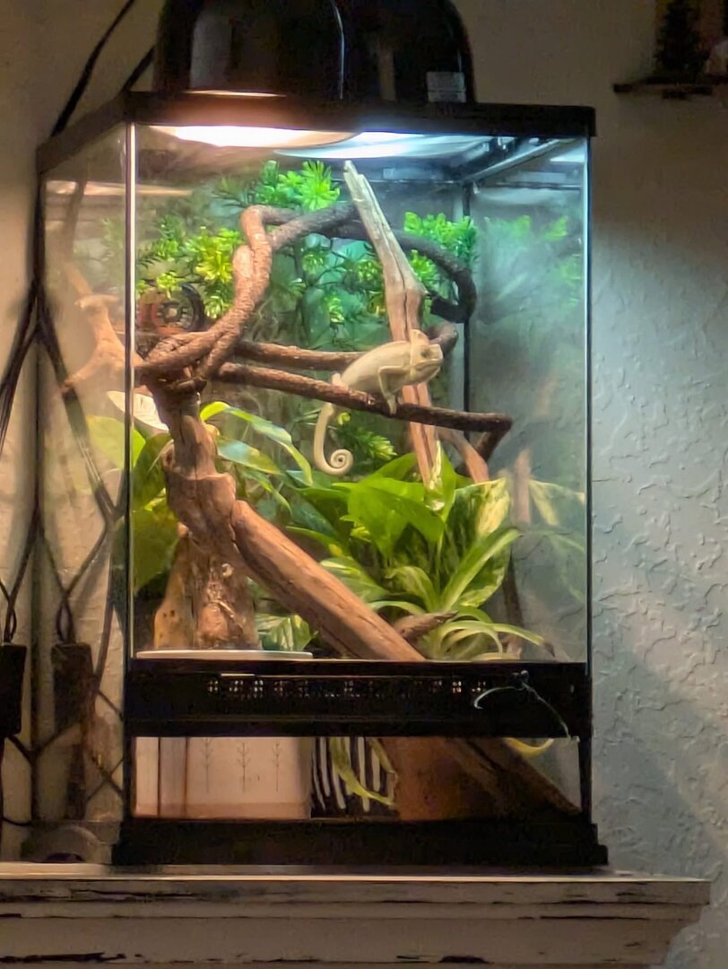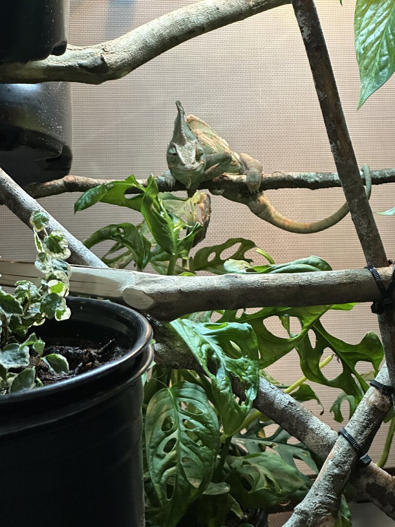 I just got our boy on Sept 29,2025 from a cousin that bought him from a Petstore (PS) in March and they told her that he was a month or so old then. They sold her their Chameleon kit( shudder) and she had been feeding him crickets and Dudia’s on occasions. She wasn’t giving him vitamins or calcium. I started building him a custom build 2x2x4 enclosure, but that went south fast. So I opted to just buy a reptibreeze xl enclosure and customize it. I changed out the bottom to lexiplate and put in a bar sink drain in the center, and I put the window film on the top door, both sides and the back as to make it a hybrid enclosure. I was having a very hard time keeping the temp and humidity correct in the small glass enclosure so I’m hoping now I can get it to the correct temp and humidity with this. I just got him in this enclosure yesterday. So I’m keeping an eye on it. I have all of the recommended lights and a homemade dripper. I have been feeding him dubias , crickets and for treats hornworms, mealworms and wax worms. I also have been dusting his food with his vitamins once a week and on the other days calcium. His poops have been the was Neptune said they needed to be. I also have all live plants in his enclosure. Please let me know from the pictures if I have the proper amount/size branches? He’s not venturing very far( I son know if that is because he hasn’t realized that he can yet or if my plant placements have him cut off from moving much( note he had absolutely no room to roam in his old enclosure! He was stuck to just one branch that was the basking branch.) I have a few plants in the bottom that I need to put in bigger pots and put somewhere. I would love feedback on what or if I need to do anything different. Thank you in advance! Oh and Skittles has formed a bond with my 16 yr old autistic son and myself! He freely climbs on our hand and up our arms straight for our heads( so far I have gotten lucky and he hasn’t popped on me yet, maybe I should knock on some wood now, lol). Last picture is of his old enclosure!