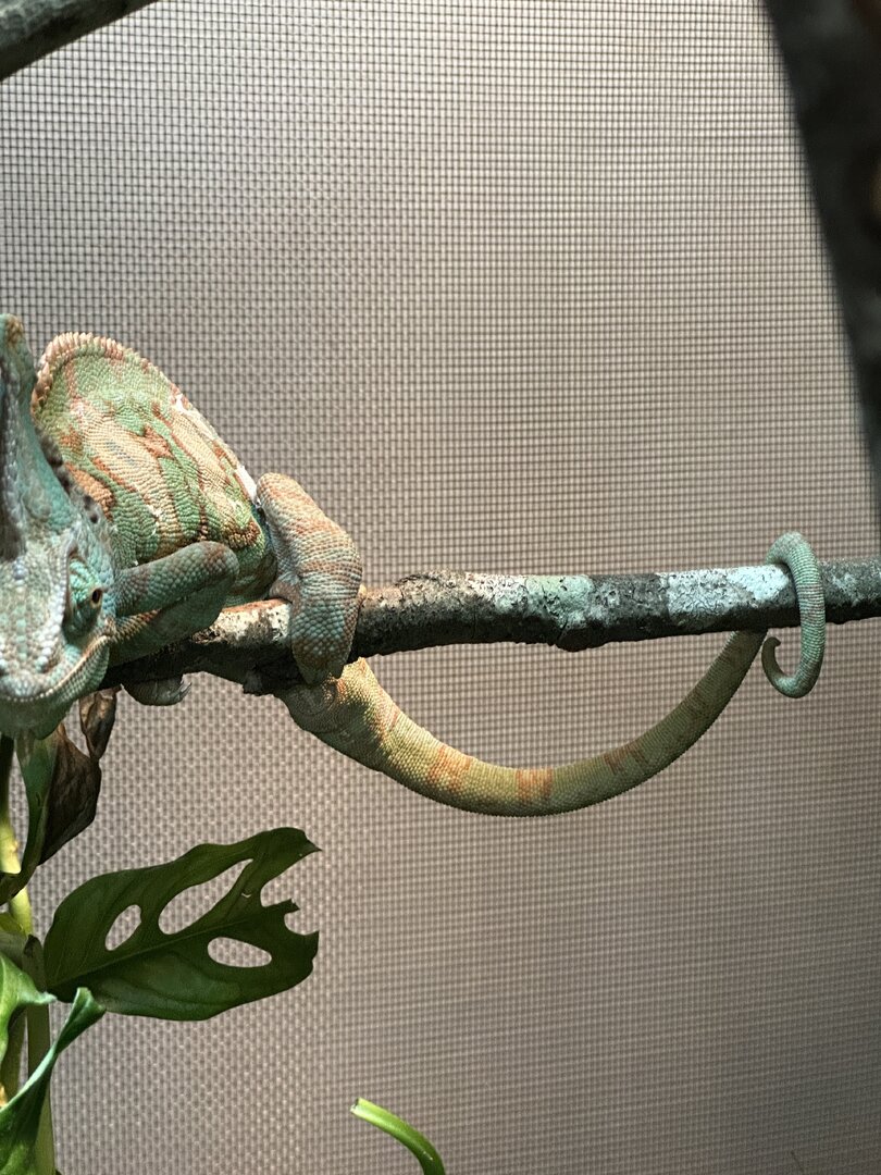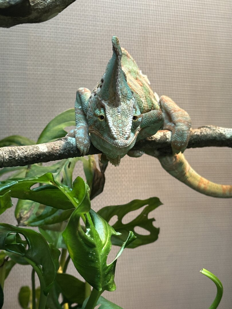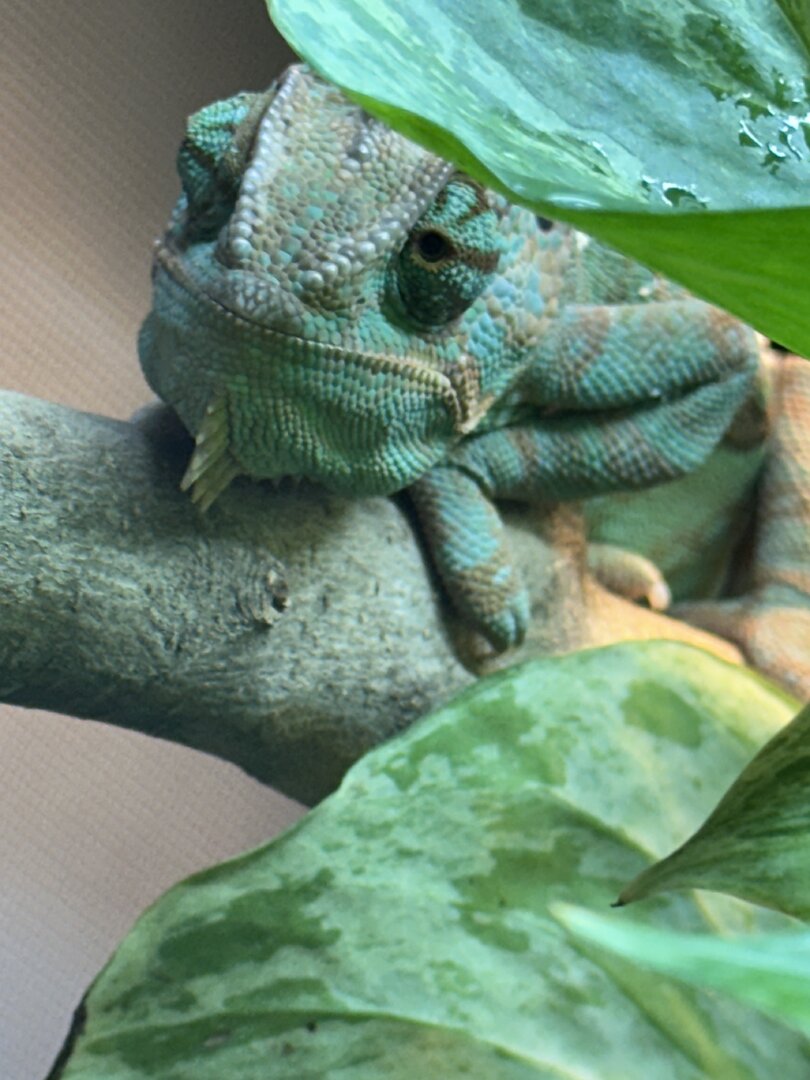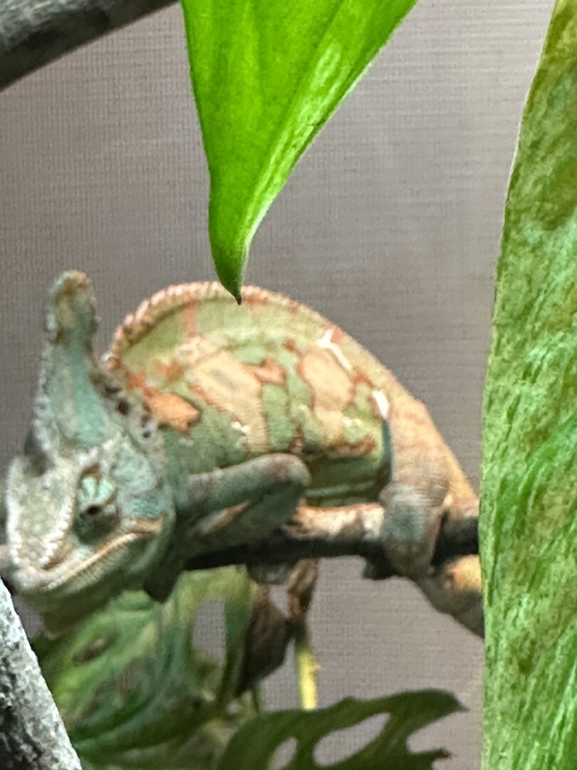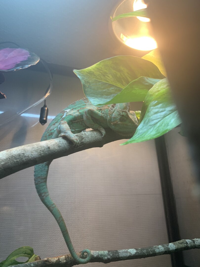 I just got our boy on Sept 29,2025 from a cousin that bought him from a Petstore (PS) in March and they told her that he was a month or so old then. They sold her their Chameleon kit( shudder) and she had been feeding him crickets and Dudia’s on occasions. She wasn’t giving him vitamins or calcium. I started building him a custom build 2x2x4 enclosure, but that went south fast. So I opted to just buy a reptibreeze xl enclosure and customize it. I changed out the bottom to lexiplate and put in a bar sink drain in the center, and I put the window film on the top door, both sides and the back as to make it a hybrid enclosure. I was having a very hard time keeping the temp and humidity correct in the small glass enclosure so I’m hoping now I can get it to the correct temp and humidity with this. I just got him in this enclosure yesterday. So I’m keeping an eye on it. I have all of the recommended lights and a homemade dripper. I have been feeding him dubias , crickets and for treats hornworms, mealworms and wax worms. I also have been dusting his food with his vitamins once a week and on the other days calcium. His poops have been the was Neptune said they needed to be. I also have all live plants in his enclosure. Please let me know from the pictures if I have the proper amount/size branches? He’s not venturing very far( I son know if that is because he hasn’t realized that he can yet or if my plant placements have him cut off from moving much( note he had absolutely no room to roam in his old enclosure! He was stuck to just one branch that was the basking branch.) I have a few plants in the bottom that I need to put in bigger pots and put somewhere. I would love feedback on what or if I need to do anything different. Thank you in advance! Oh and Skittles has formed a bond with my 16 yr old autistic son and myself! He freely climbs on our hand and up our arms straight for our heads( so far I have gotten lucky and he hasn’t popped on me yet, maybe I should knock on some wood now, lol). Last picture is of his old enclosure!