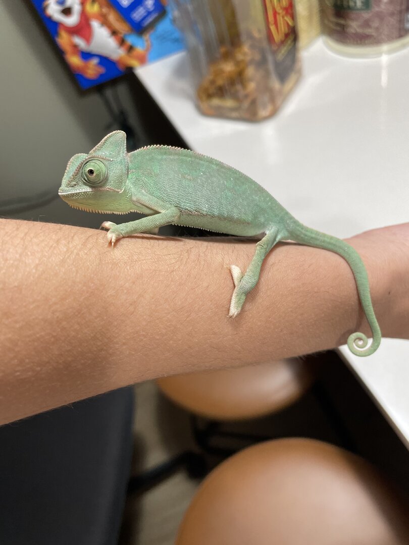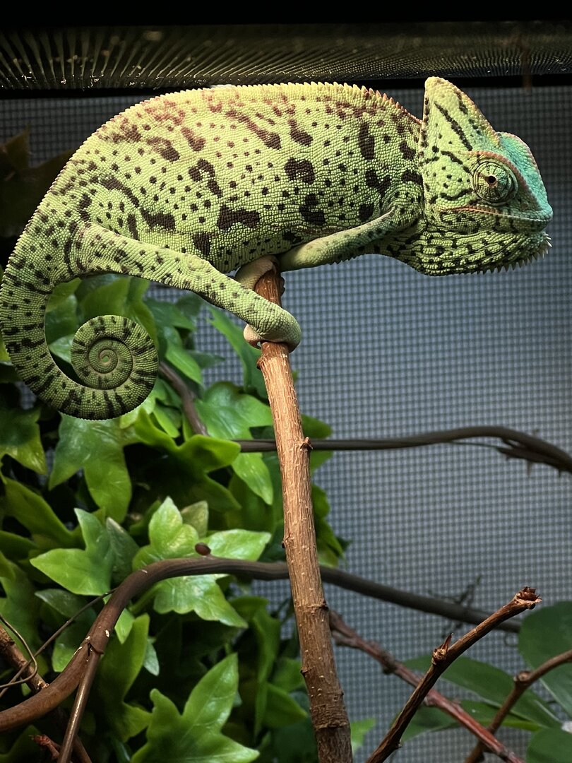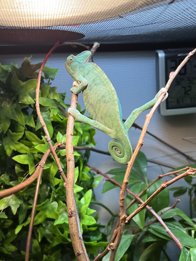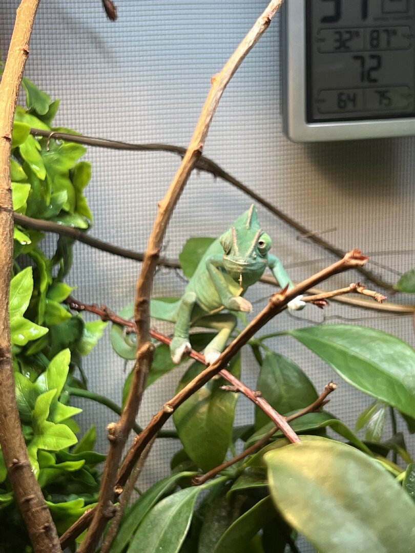 Anyways, I was lucky to pick up a low morph piebald (very small amount of white on her feet) veiled chameleon from Petsmart about 2 and half-3 months ago, and I’ve done everything in my power to make sure she is taken care of correctly. Her exact age is unknown; however, I am assuming she is around 5 months old now. She has shed twice since I’ve had her. I am looking to rehome her because I just have too much going on with my life at the moment, and I have a lot of traveling to do in the near future. My girlfriend also isn’t a fan anymore. I’ll attach some photos.