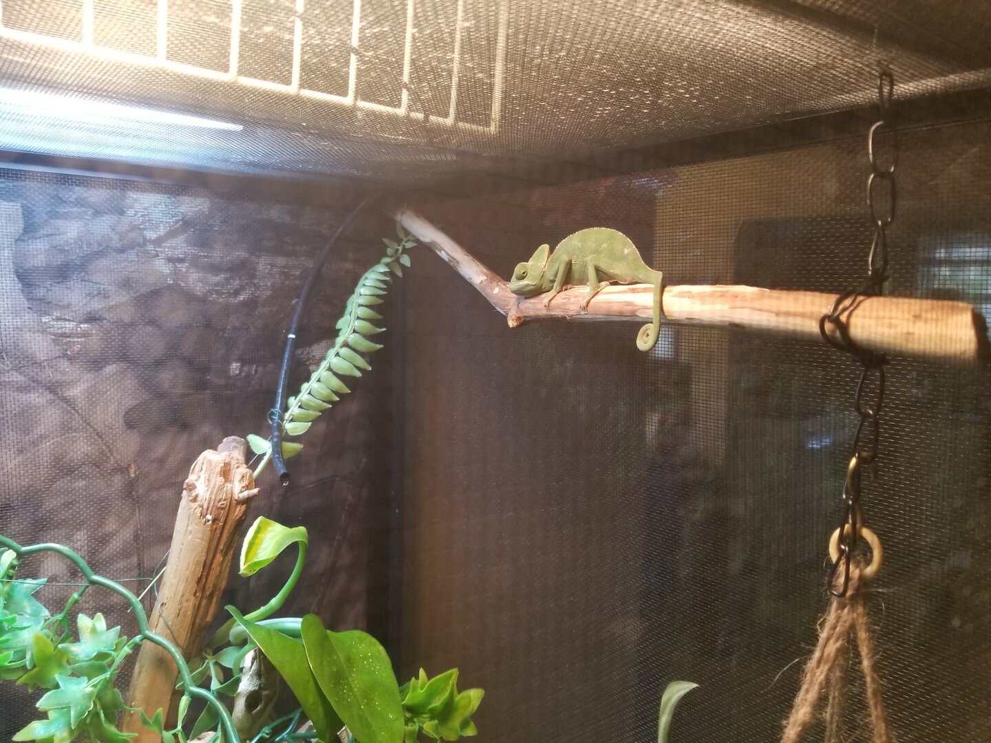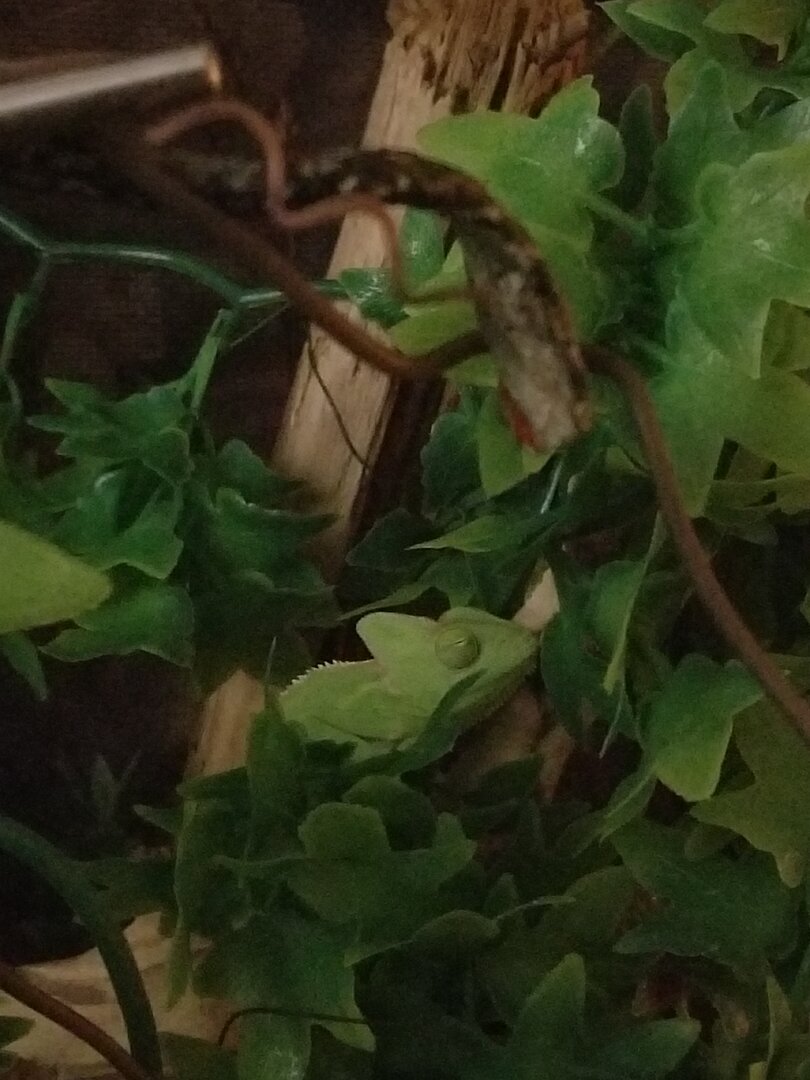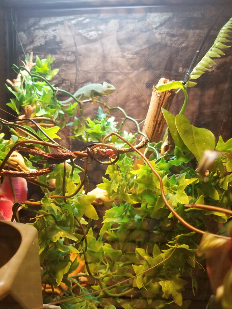 I have only had my set up with my new little veiled chameleon girl for a week and a half. My husband got her for me as a wonderful surprise for Valentine'a day. I've always wanted a chameleon but never thought I'd actually be able to get one. All that to say, I ended up quickly just getting a Reptibreeze kit which is what they had at the pet shop. I started out with both real and plastic plants. The kit came with this thick vine, which I really like the look of, and Jade (that's her name) actually likes it too because she crawls down in at night to sleep. I have about 6 pothos vines in there already, but not enough to totally cover that wood. I have a bunch more pothos in water to get going, so eventually there will be enough to fill it out. In the meantime I wait. Here is my question. I know now that the plastic leaves are bad.. that when she gets bigger she might nibble them. But what about the vine part? Would I be able to just leave that in there wrapped around like it is, and snip off the leaves, then have the pothos grow around those plastic vines? See how she sits and walks across that one in the back? It's the one under the UV light and she does sit there a lot. I know grapevine would probably look better, but I don't want to stress her out by tearing it all out and redoing the whole thing. Could I just cut those leaves off a little at a time and move the real leaves around. ??