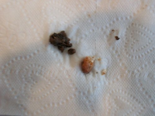 Fecal Description - (see picture below) I have also been seeing white solids in a yellow membranous sack, which I had been told were unused eggs from her pregnancy