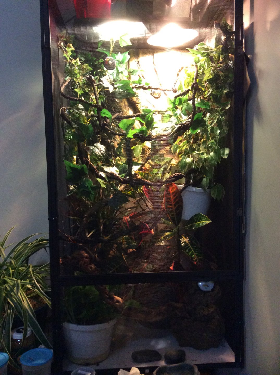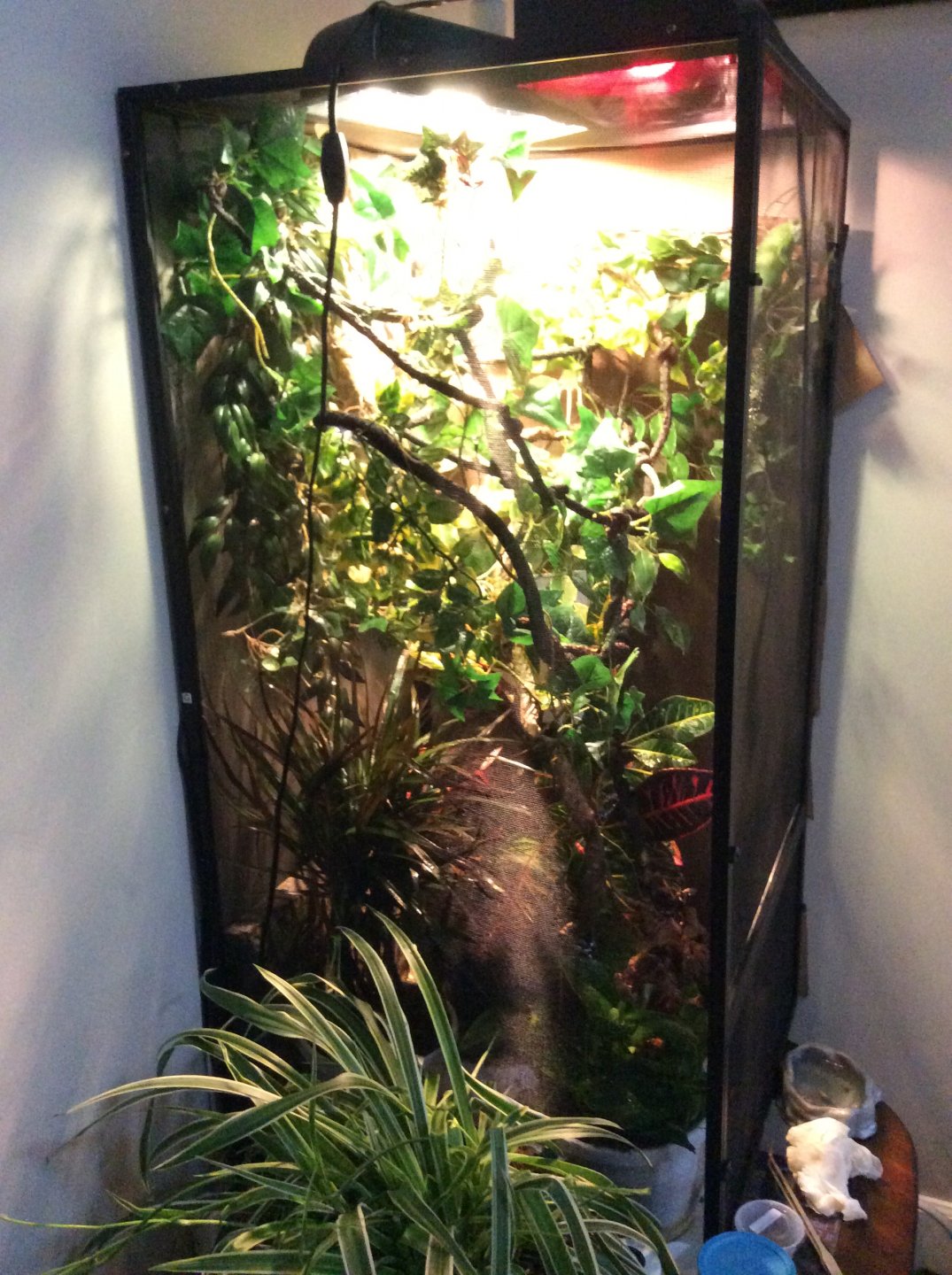 - Cage Type - screened 18x18x48 I think.. It's a large size reptibreeze. I had him in a national geographic vertical terrarium 26gallon with one side has mesh and on top but I was worried he wouldn't get enough fresh air circulation so I upgraded him into reptibreeze after two days.