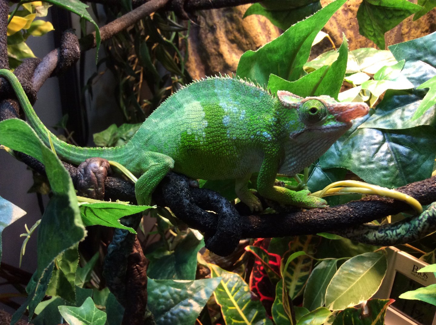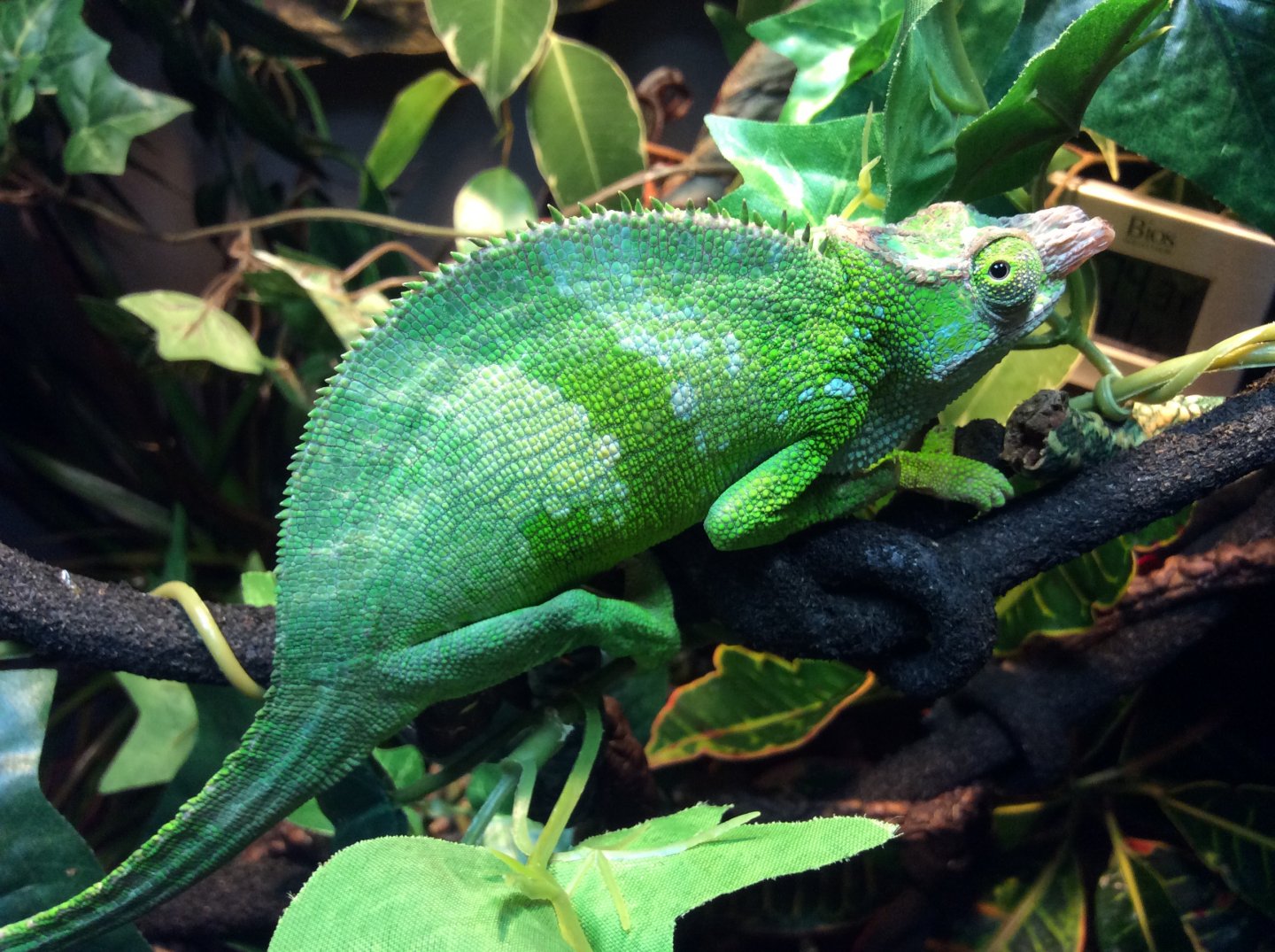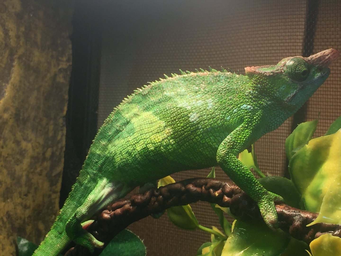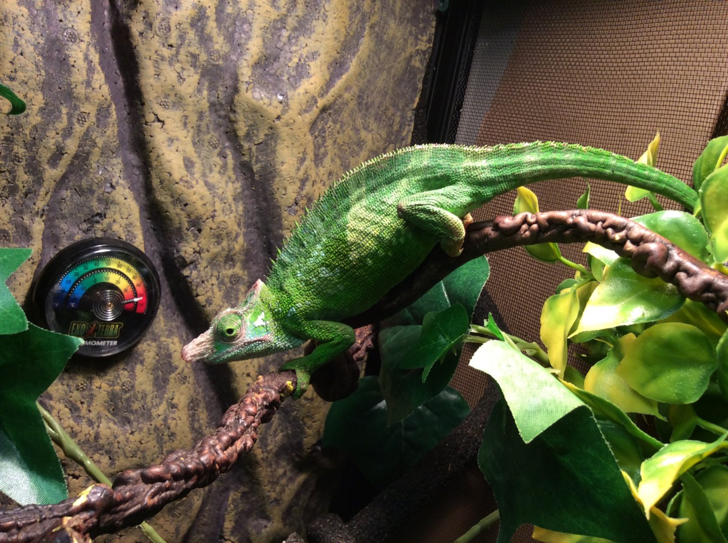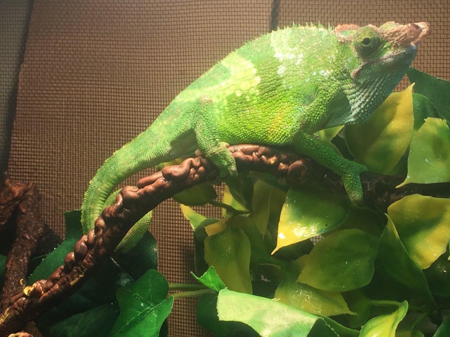 Current Problem - my concerns is he only ate total of 2 crickets since I got him and they were both fed from a tong when he was inside my glass terrarium but he haven't eat since I moved him to the reptibreeze cage 4 days ago. He always climbing on the sides of the cage and sometime have trouble hanging on it. He spend some time on the bottle of the cage during day and not using basking spot. He haven't hunt his own food when I leave crickets in there so I always have to try find them but fail sometime because they hide. Hoping someone can tell if he looks healthy and if something is wrong. He shedding around his face but not body and I mist him directly but from a far distance so he's not shock, sometime he just stands there for whole session but sometime he moves away from it. Also what should I do about bottom of my cage because when I mist or water plants, the floor is flooded and always have to wipe it dry. Is there a way to prevent it? I have the reptile soil and barks mixed together already but haven't used it because scared he might choke on it . Sometime when I wake up I see him hanging on side of cage sleeping.. Is that a problem ? I'm really worry something wrong with him and the closest vet is an hour drive for me because I live in Surrey and worry the long drive will really stress him out. Also can anyone help me sex my chameleon and what type of Fischer he is and estimate age he is?