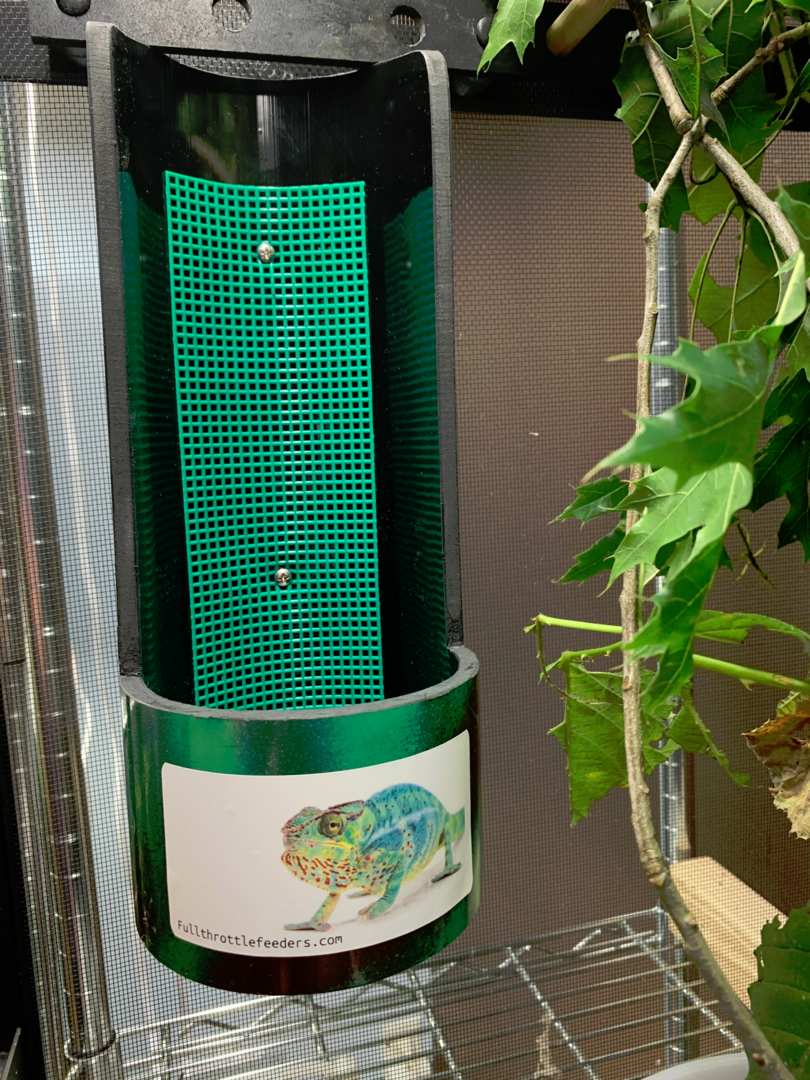 It's not the enclosure they're likely to escape from; I thought we were talking about keeping them in the feeder cup. If they do escape the feeder cup into the enclosure, your cham may hunt them down; some folks feed that way anyway. Or your cham may not venture that far down into the enclosure (at this age). Mine stays in his "trees" so if I find a loose cricket or 2 (like I did today) I just pick them up and plunk them back in his cup. Within a few minutes... ZOT!...YOINK!...MUNCH, MUNCH, MUNCH...GULP! 😋