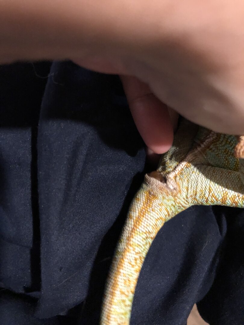 - History - When he was purchased by my son for his grilfriend when he was about three months, there was a large scab on his forehead and they told them that it was from teh other chams picking on him. They felt for him and is why they got him.. after I got invovled, I saw that teh mid section of his left eyebrow was gone and there is a scar and teh base of teh casque ridge is gone. Something very heavy same down on his forehead at an engle and casued this injury, The older he got he less he was able to hunt which is why I hand feed him now. about 11 months ago my son left his gorlfirnd and stayed here temp adn then found out he was not being fed or misted so I told him to go get him now. He was severly stressed under weight adn dehydrated. This when I got invloved. 2 months later, I came home and my son said he had him out and could not find him and he ahd been missing for an hour. I had him turn everythgin off in the apt and I listened. about 3 minutes later I heard a noise in the heater. I opened the bottom dorr and saw a ltille bit of his face, he was stuck. I got him out, but he had gotten injured intitaly I tought I might have scraped his back and crest against the metal bottom when I was trying to get him out even tough I didnt feel him hit anything. But it soon turned out to be severe burns so he must have been wedged agsinst the pilot light area as the heater was not on. I immeidalty started to cvoer each area with silver sulfante as I tought if woudl be mild enough but still have an antibiotic element to it. Hes topped eating and it is the only time I have seen him drink water. I took him to the vet and was told to keep doing what I was doing and that it takes a long time for burns to heal on chameleons and the spikes would eventually die and fall off and the ridge too on his casque but would probably never grow back. I Continued to nurse him back to health and am happy to say that the spikes and top part of the ridge is growing back and the side of his casque that was white and thin is starting to get smaller iwth each molt. The only other issue was Respiratory Infection from sitting under the fogger at night. Vet gave him baytril and Ornax as well as inject5ions of all vitamins. He is very attached to me now and wants to be with me all the time.;