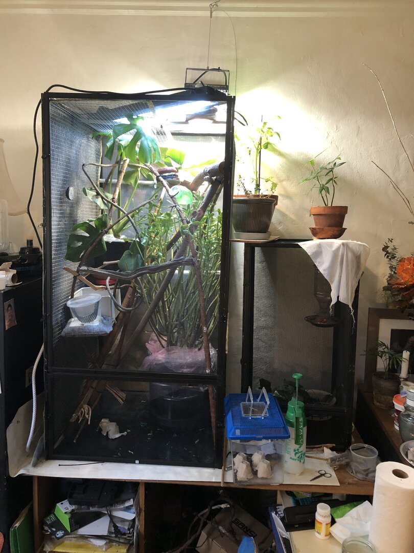 - Humidity - standard 50% increases to 80% during fogging and misting times. humidity gauge at midway area of cage. Mornng I take him out and let him sit
