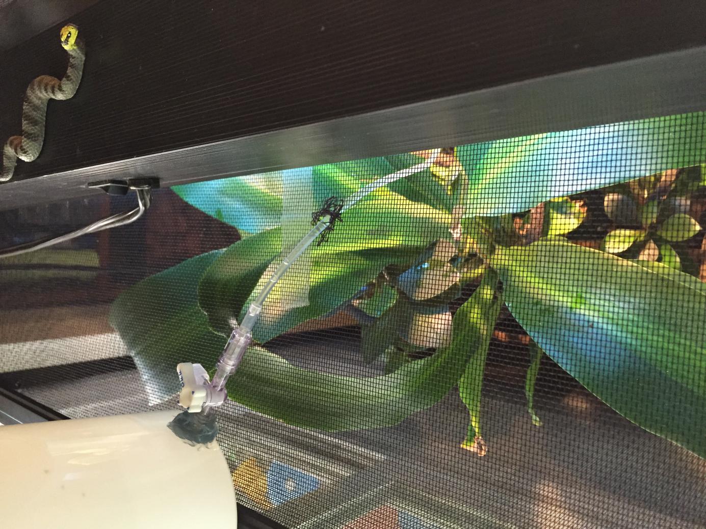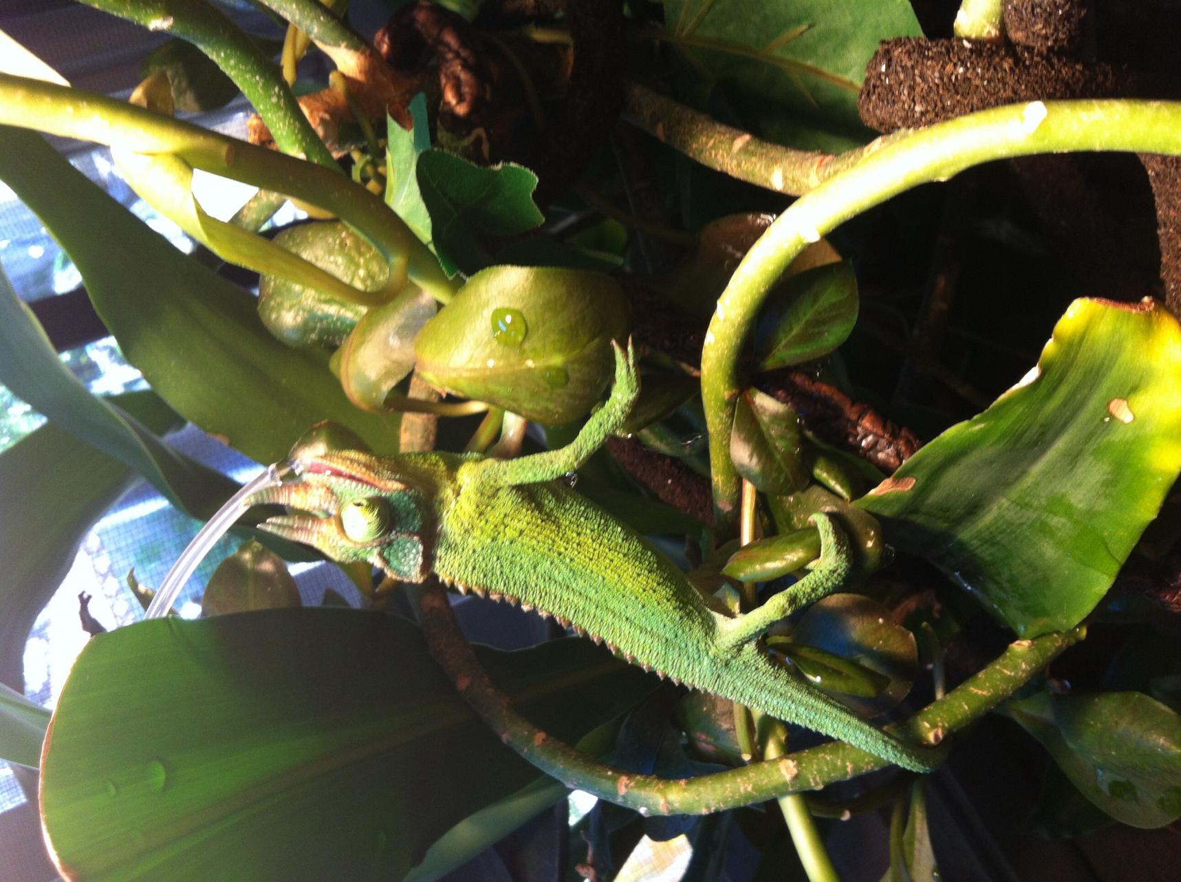 So i wrk at a hospital nd was able to get some supplies to create a drip system and my chamm loved it, instead of drinking off a leaf he grabbed it nd postioned it to his advantage.. Lmao