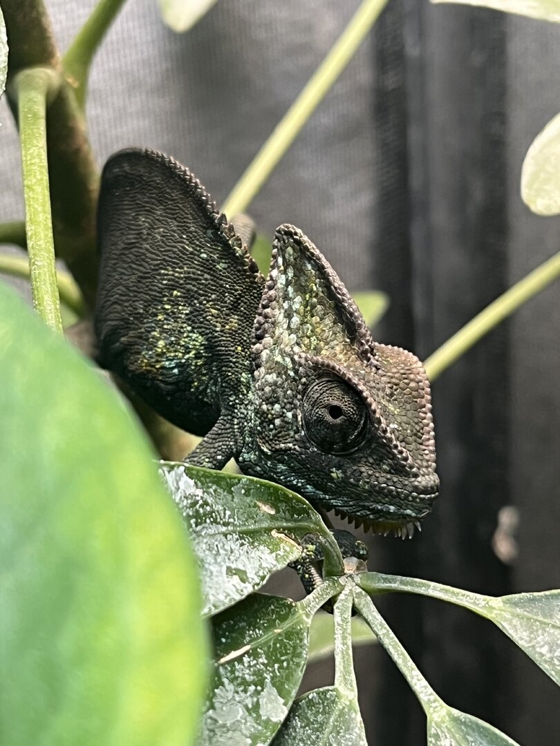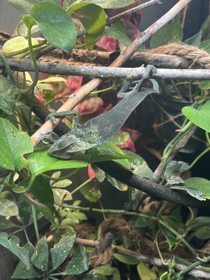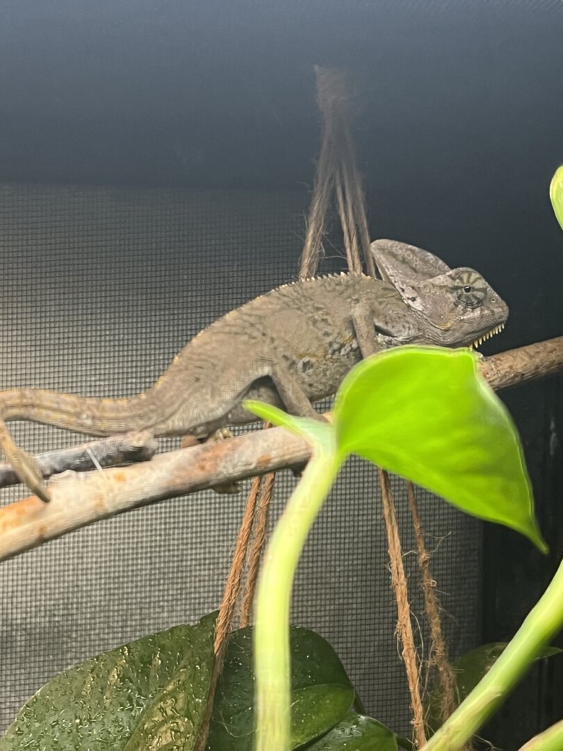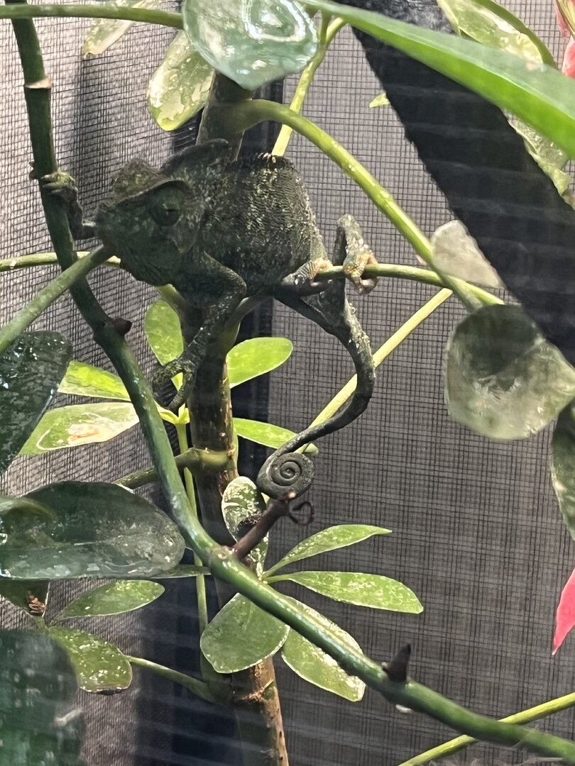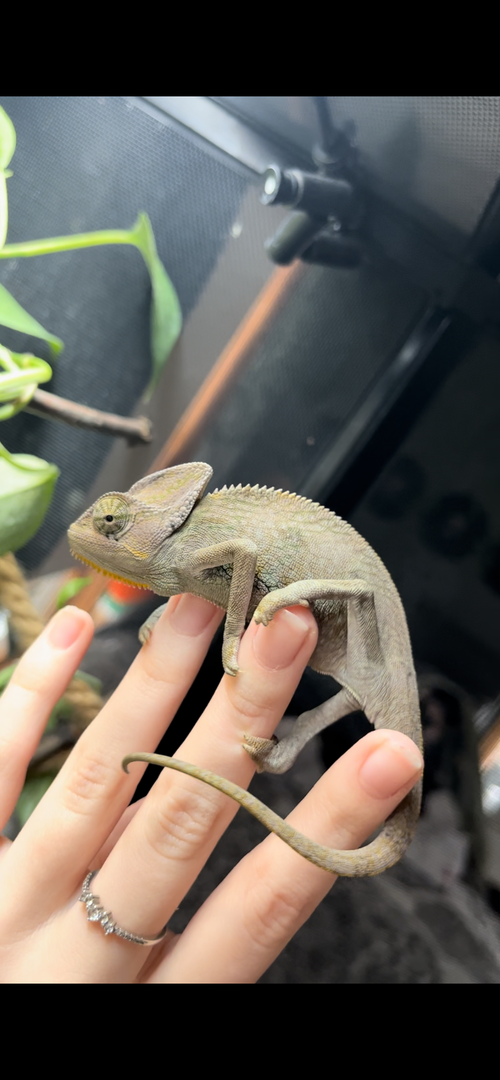 ) is about 4-5 month old male veiled chamelon. iāve had him for two days now and am homing him for someone else. i donāt know how long iāll be homing him so iām doing the best i can. if i do still have him as he gets bigger, i will defiantly purchase a larger terrarium, but this is what i have for now. - Handling - heās very chill. i never go to pick him up but as i spray him sometimes he just crawls onto me