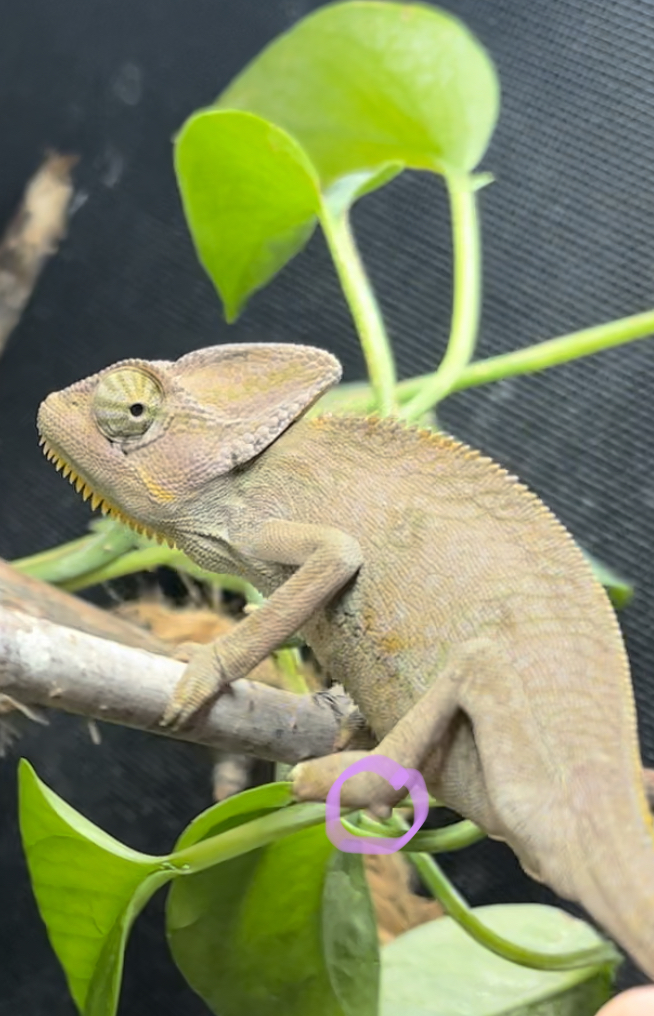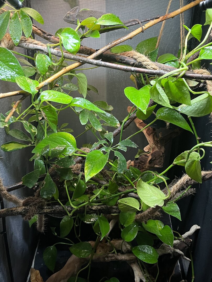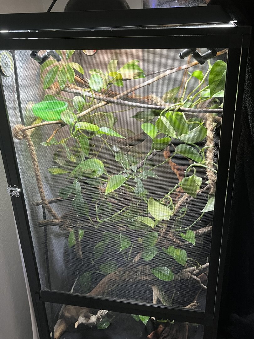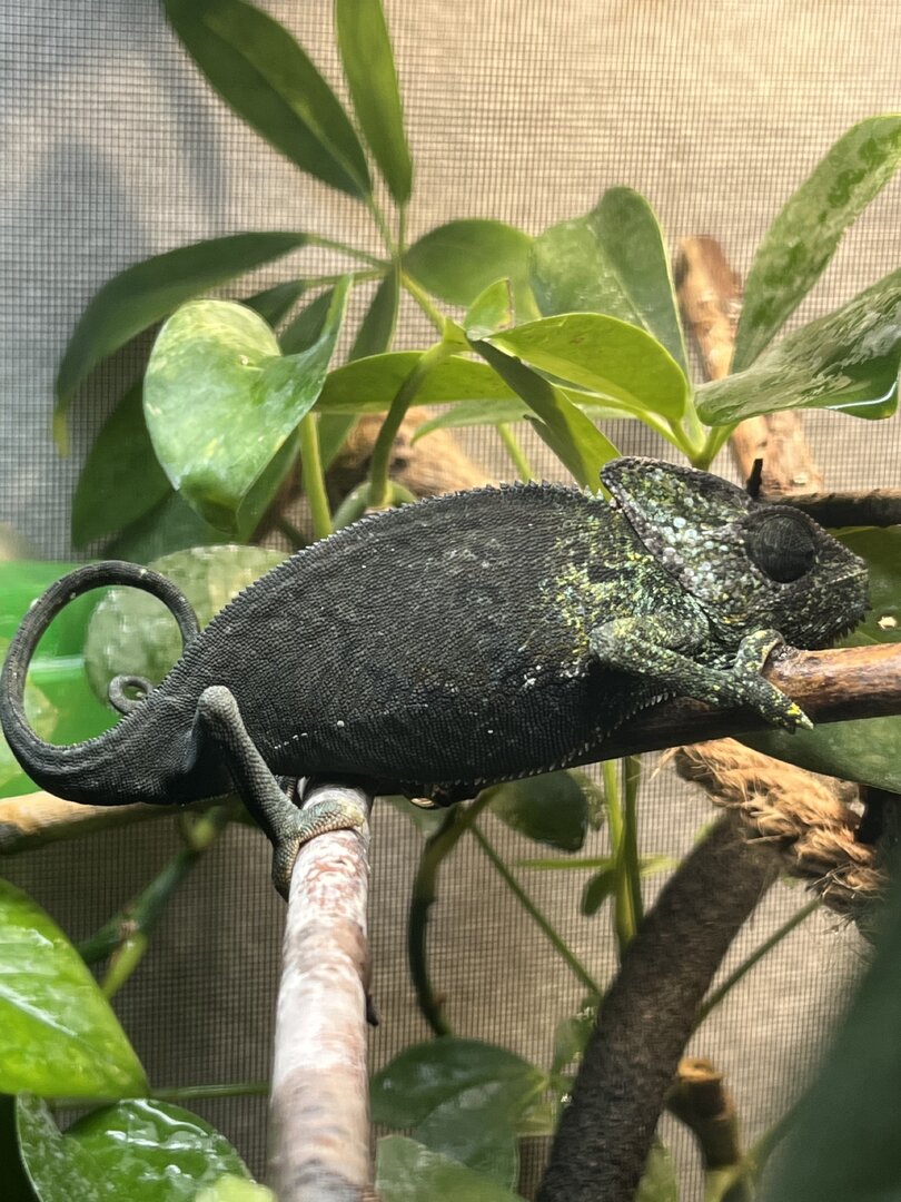 ) is about 4-5 month old male veiled chamelon. iāve had him for two days now and am homing him for someone else. i donāt know how long iāll be homing him so iām doing the best i can. if i do still have him as he gets bigger, i will defiantly purchase a larger terrarium, but this is what i have for now. - Handling - heās very chill. i never go to pick him up but as i spray him sometimes he just crawls onto me