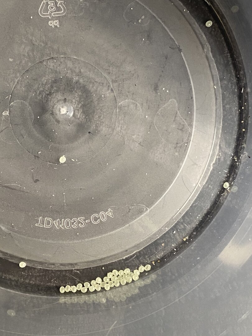 It took about a day for them to dry their wings and then they got down to business. Similar to silkworms, they do make a bit of a mess spraying their secretions around. I’ve no idea how to determine their gender. After day 2 I found their pale green eggs scattered everywhere. They need to be collected promptly or they stick too firmly to be removed. Some that were laid on the branches just wouldn’t come off and I learned that although the eggs are pretty sturdy, if they are well adhered, you’ll destroy the egg trying to unstick it. The moths are nocturnal, so you can collect the eggs during the day when they are asleep. Every day you’ll be collecting dozens of eggs. After your first egg collection, you’ll need to get your chow ready. I had a bit of a problem with the water/chow ratio (instructions called for too much water), but as I had only mixed up half the package, I was able to correct it. I had some of the traditional tall deli cups with gutter guard that I put the chow into. I added a little mesh as the gutter guard didn’t reach the top. Initially I put the eggs on the lid (the worms natural instinct is to climb), but after collecting so very many eggs, have just started tossing them in the container of chow. I placed the deli cups upside down on top of my beardies enclosure next to his lights for some gentle heat. Within about 3 days, I found babies. They are super tiny and almost translucent. The easiest way to find them is to look for their horn. It looks like a petite eyelash. They are impossible to move without risk of killing them at this point.