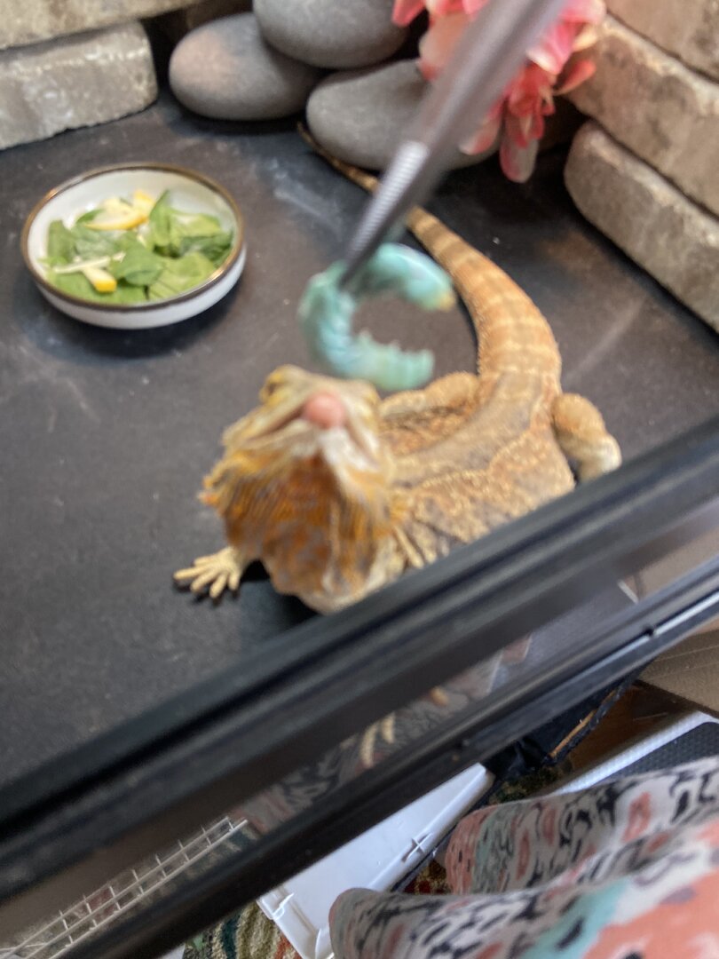 Spike has just been a crazy beardie all around…head bobbing non stop, running all around with his beard pure black and eating his salads almost violently! When he sees a green gummy worm…O!M!G! He goes insane and will hurl his body to it! (Same response when he happens to catch sight of Electra) Unable to get it on video or pic, but with great effort and a little trickery, was able to get a calmer looking pic.