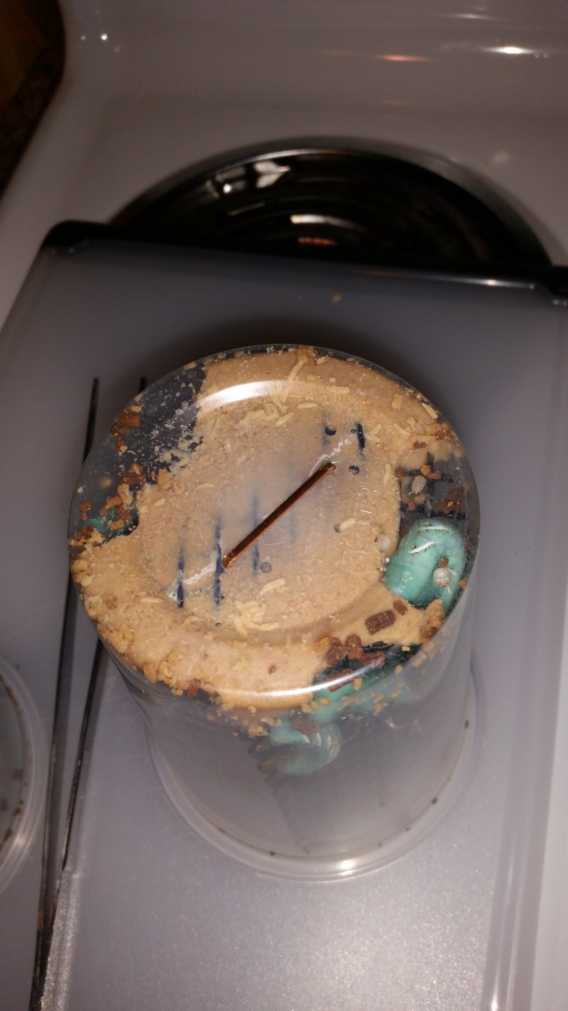 A wild fruit fly or drain fly got in the cup and laid eggs. It happens from time to time. I wouldn't worry to much about it