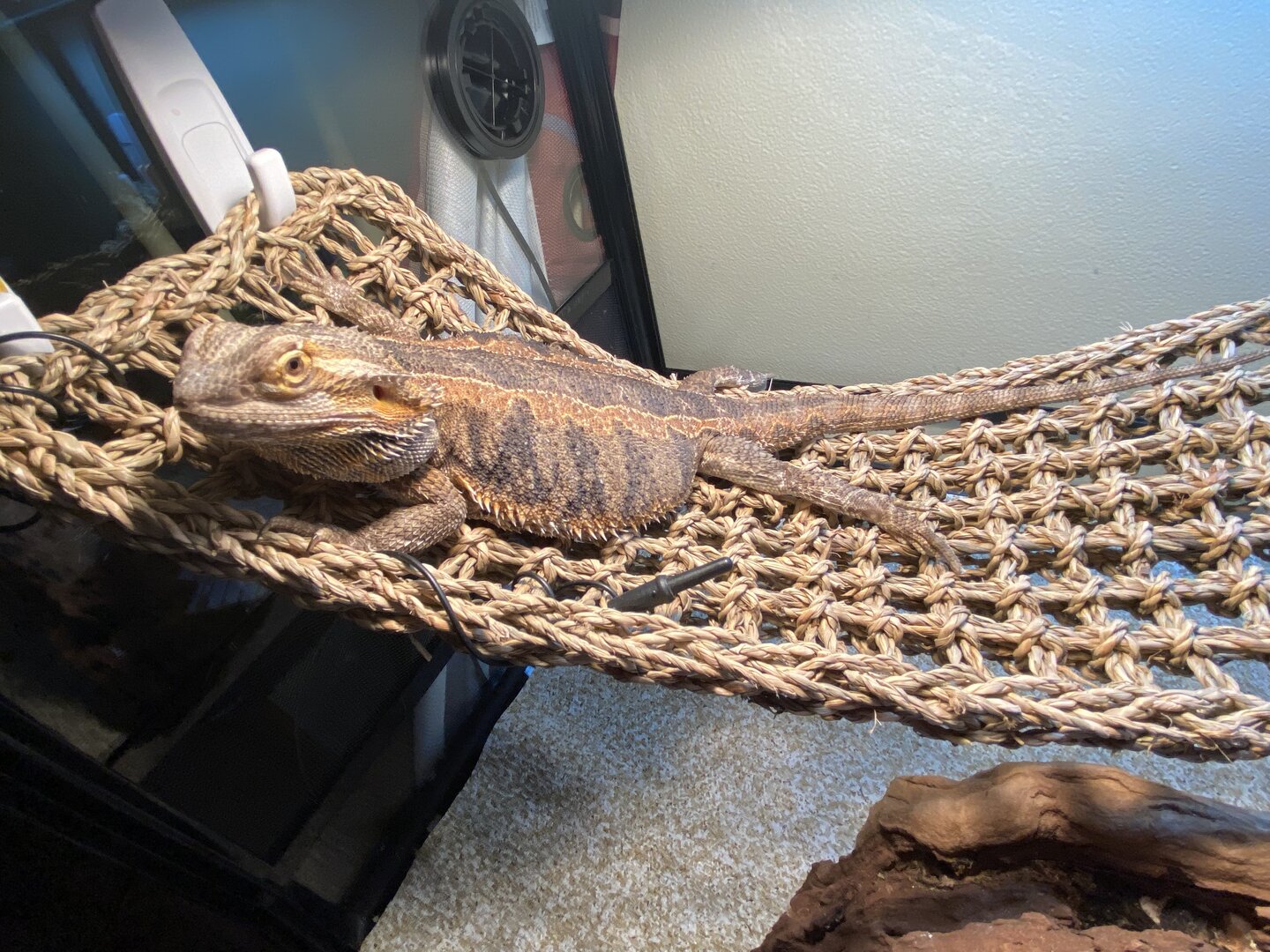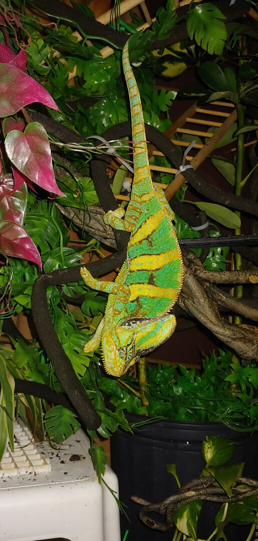 My male veiled, a rescue on death's door, had been improving for over a year- getting stronger, climbing somewhat improved, etc. Had an accident and nearly died...anyhow we think he has brain damage. He is unbalanced, will let go while climbing, regularly grabbing front legs with back..leading to falling over. He eats very well and takes water from a spray bottle or syringe. Temps are good. He is in a medium exo terra. He wants to climb and I have some branches in there, etc. He is constantly falling- upside down, etc. He appears content even when stuck. I am at a loss as to how to set up his tank. I keep changing it and it...i feel it could be better. Can you show me some pictures of your "special" set ups? I want the rest of his life to be the best it can be. Thanks