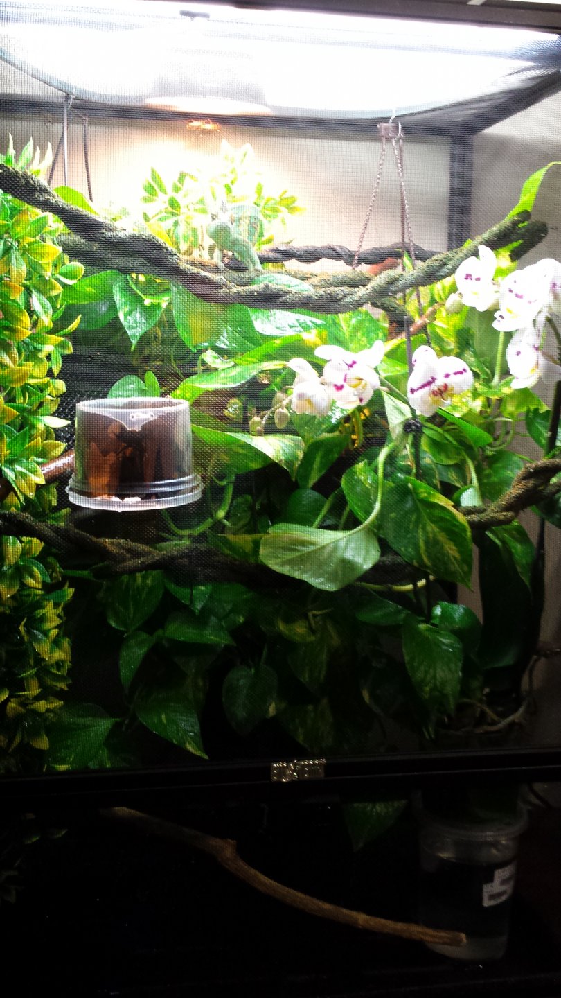 The way I have my spiderplant is I have a large one under his drip system and a small one by where he's fed and you gotta have a basking point 4-5inches away from the light so he gets just warm enough but doesn't get burnt