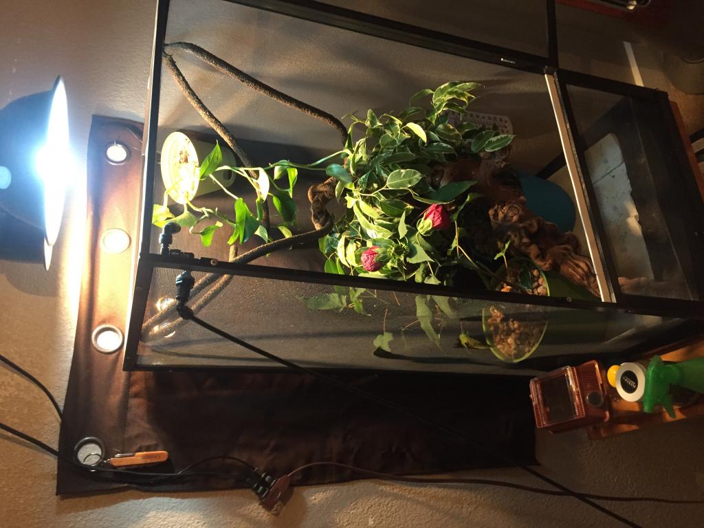 I just finished my temporary setup for my Panther chameleon I'll be getting at the end of this month. I think I did pretty good! But always welcome to opinions. I'll have to build a larger enclosure as my chameleon grows, being male. Save this if I ever get a female. As for details for the pic: the larger dome is a Reptisun 5.0 UVB bulb. The smaller dome(behind large dome 1inch higher, could only attach one pic) a ExoTerra 75W basking bulb. A MistKing misting system. Hibiscus, ficus and pothos plants with coconut husk and sand mixture for soil, covered in river rocks. I think that about covers it. What do you pros think? Be easy haha...