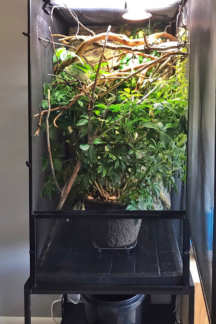 Can I ask what giant plant you have in there??Agree! Add some live plants and a ton more branches! Chameleons need to feel safe and have places to hide among foliage. Here's a pic of my enclosure, just for reference.