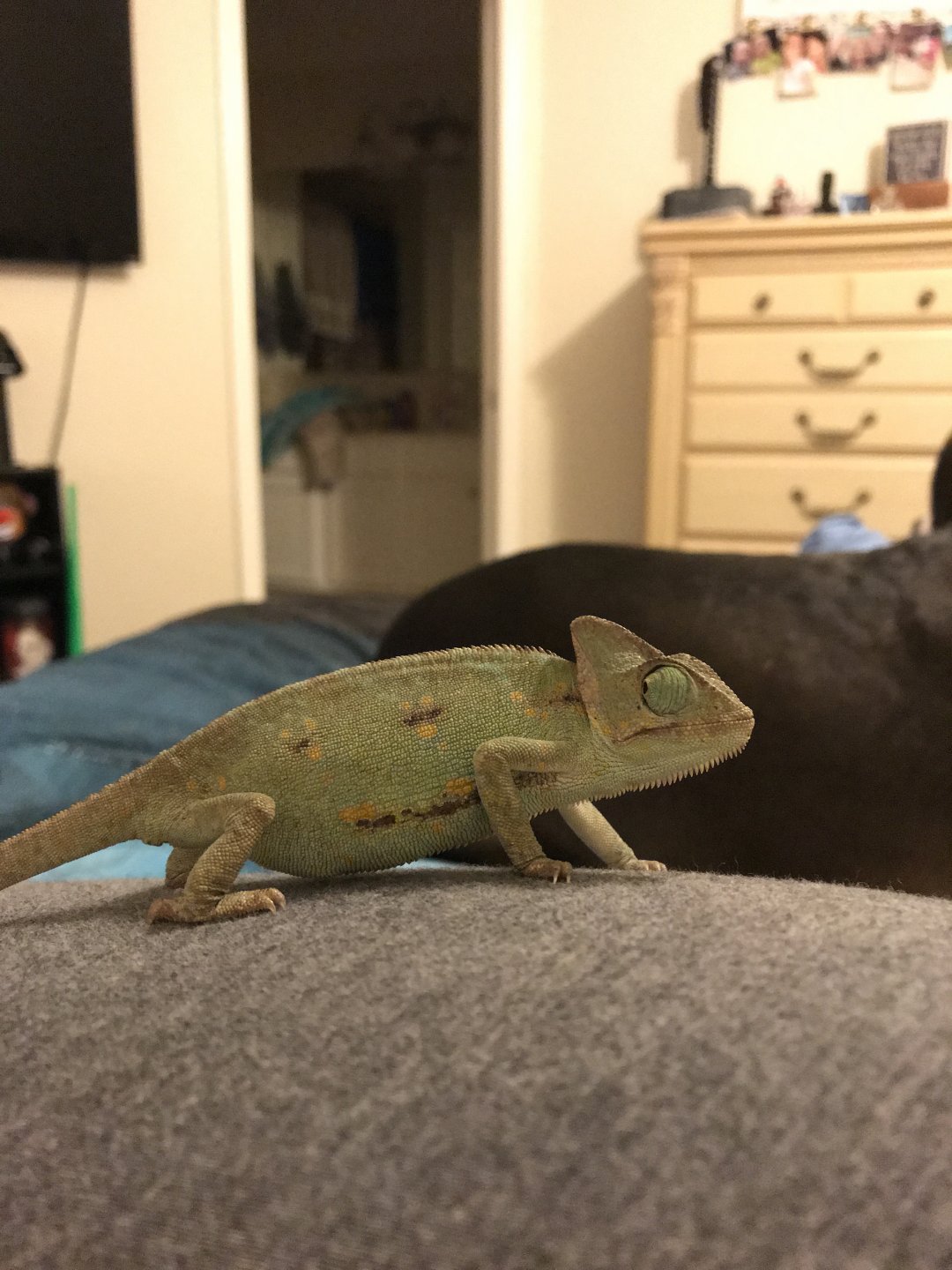 Nice yemen chameleon. I think its done by length. 2 months is about 3.5 inches so you can go from there. Im a newbie to chams so i dont know a whole lot yet. You may want to wait for other replies too.