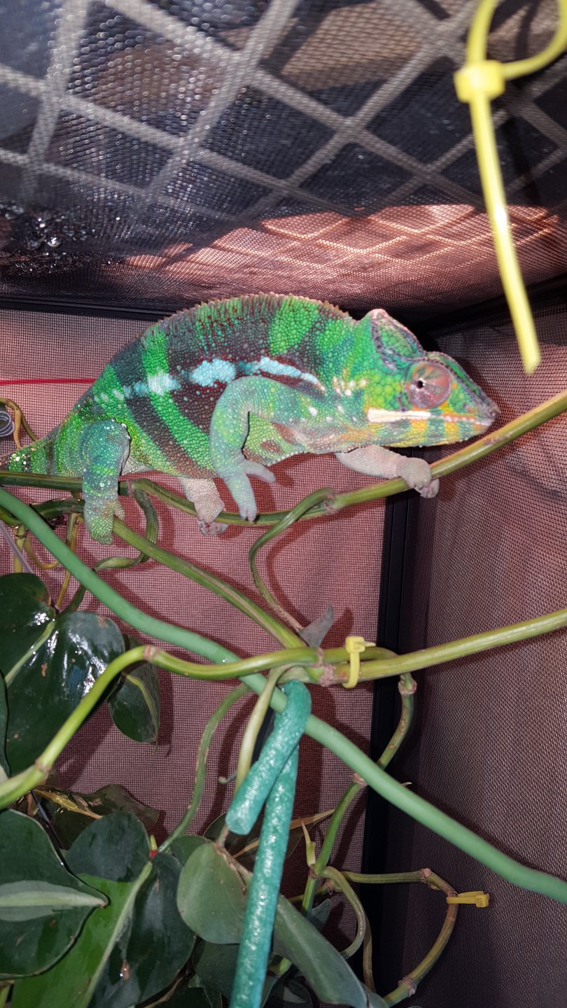 My cham is 16 months old. I have had him over a year. He is ambilobe blue bar male.
