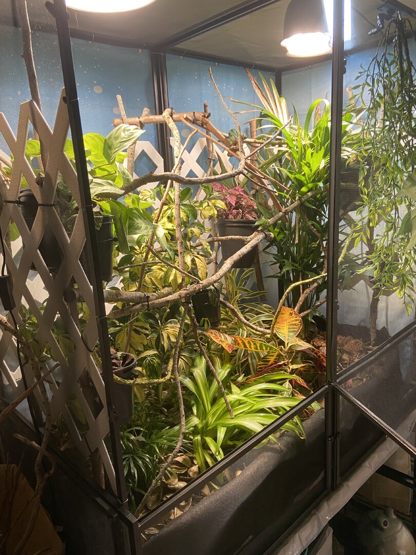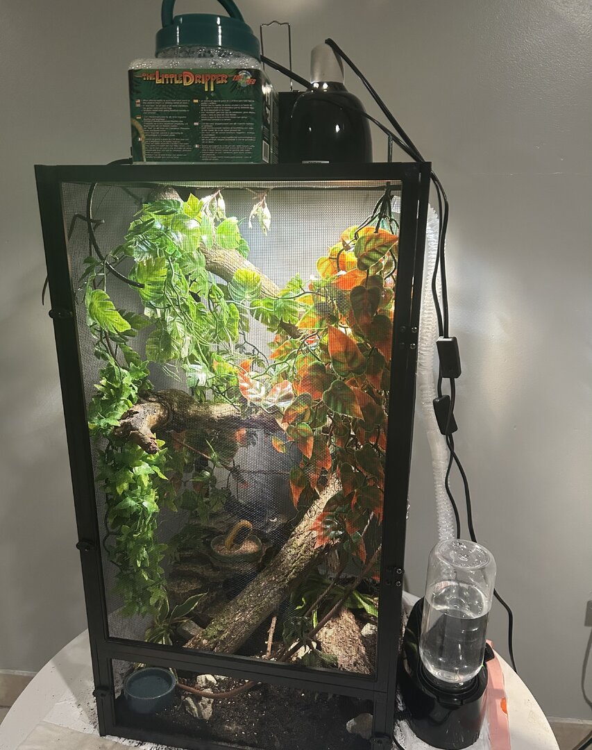 Watering - I have a dripper dripping constantly. I mist every maybe 2 hours for a couple minutes. I only seen him licking a leaf a couple times.