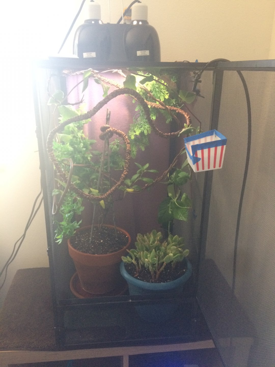 2 fake green vines on either side of the cage for coverage and to hold water,