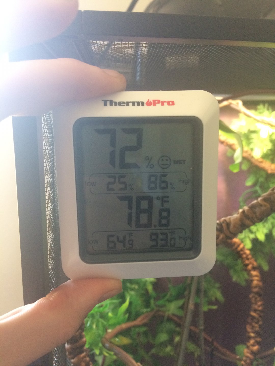 I have a Monsoon mister which runs on differing shifts for day and night, as well as a humidifier in my room, as I live in Colorado and need to keep the humidity up for my panther. I also mist manually with a spray bottle through-out the day when I feel Lil P may want a drink or the environment is looking dry. Basking spot is about 80-90 all day and all lights go off at night, as well as humidity and temperature dropping at night. I handle him about every other day taking him out to the real sunlight for some natural UV. I let him chill on my hand/arm and he also gets time to hangout on a hanging pathos I have outside. Diet consists of gutloaded crickets dusted in calcium every day and dusted in d3 once a month. He also gets spoiled with small hornworms when the time is right (all the time haha - about 3-4 a week).