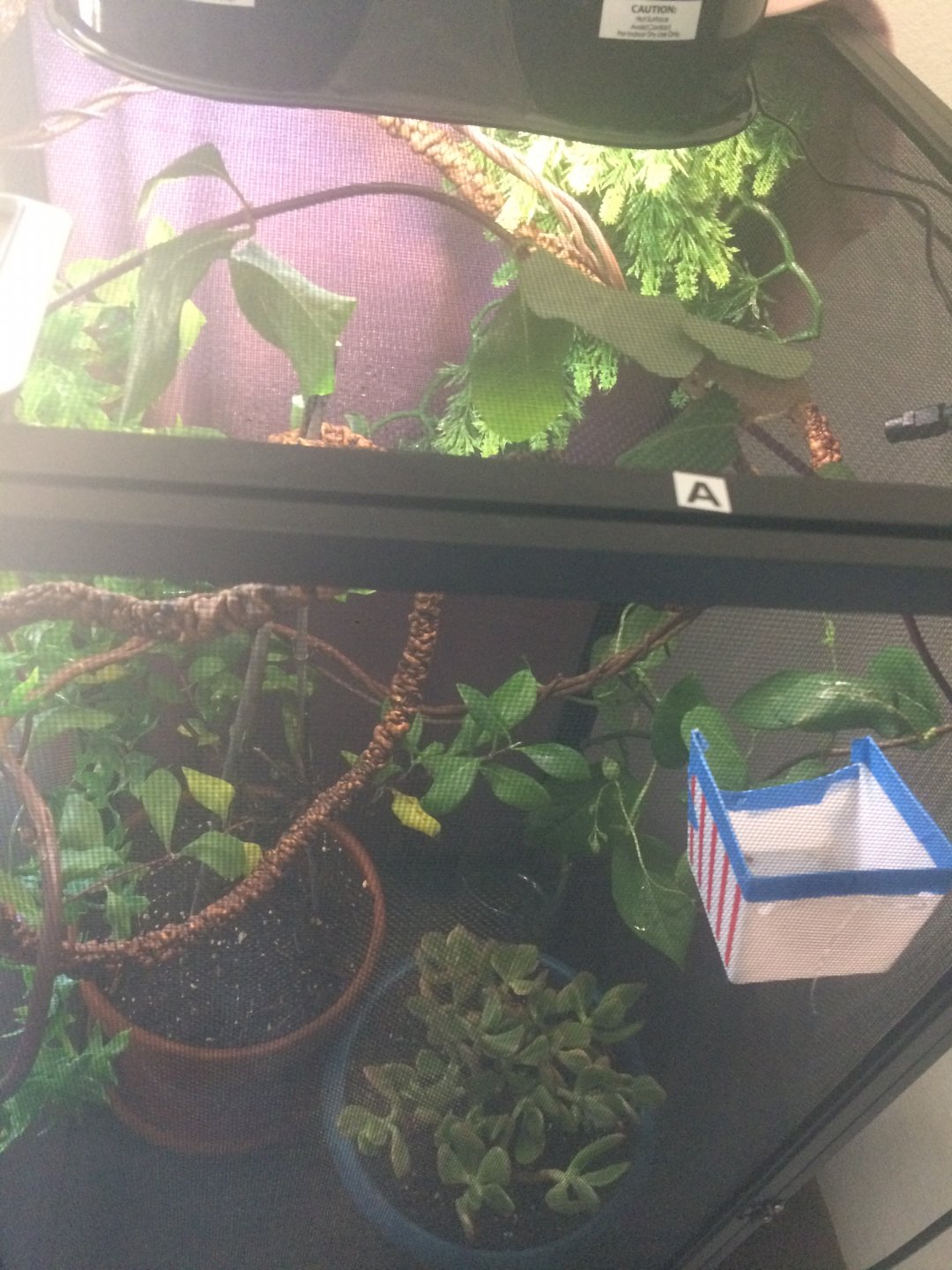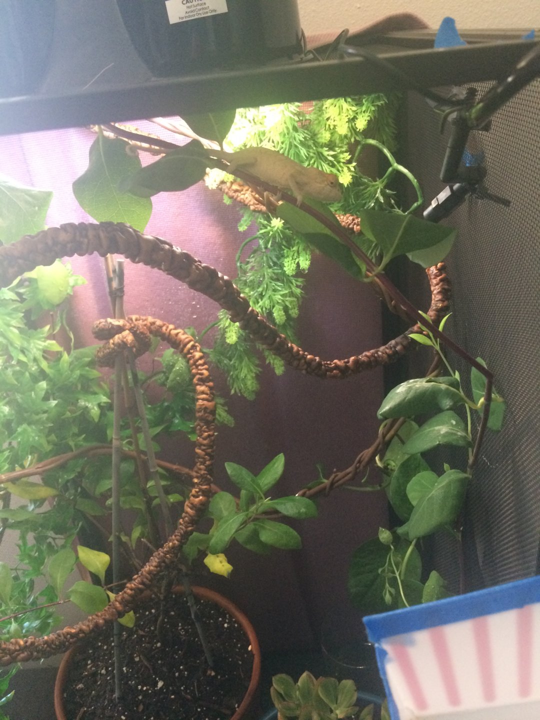 2 fake vines stranded across the upper half of the enclosure for walking/hiding/playing,