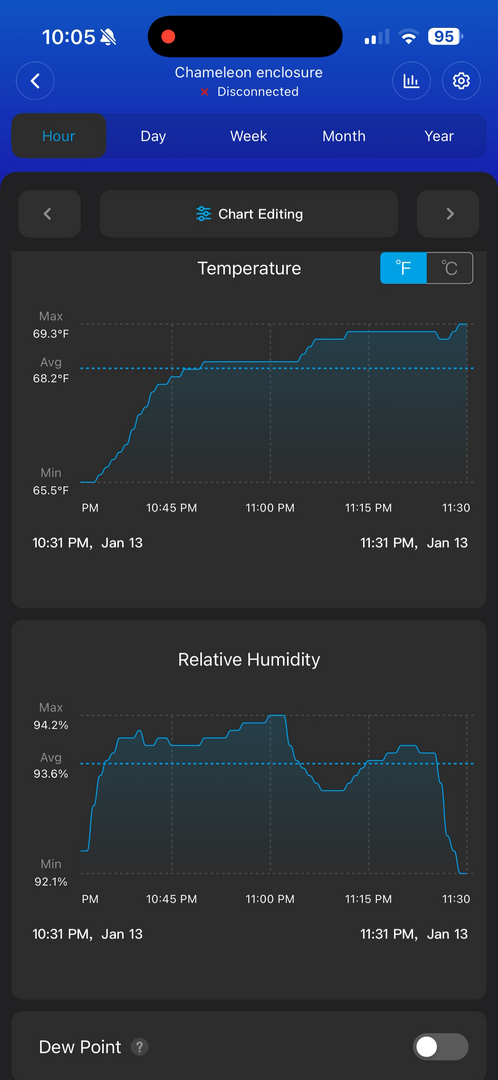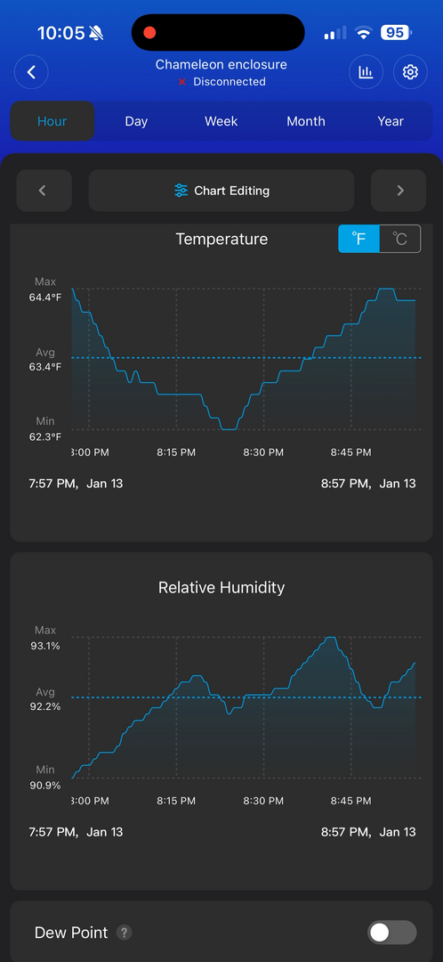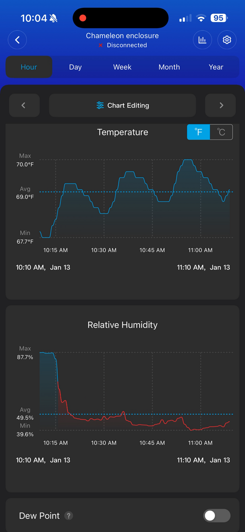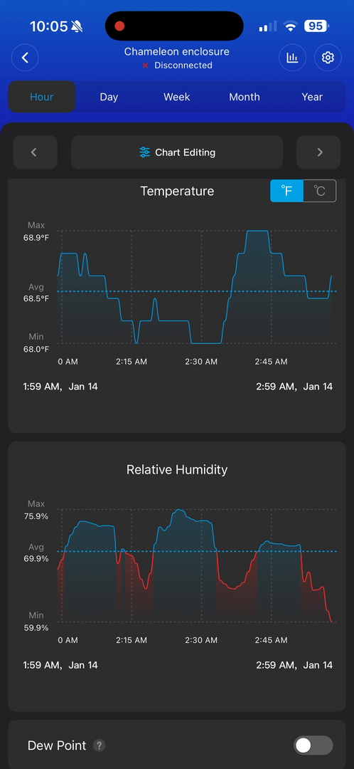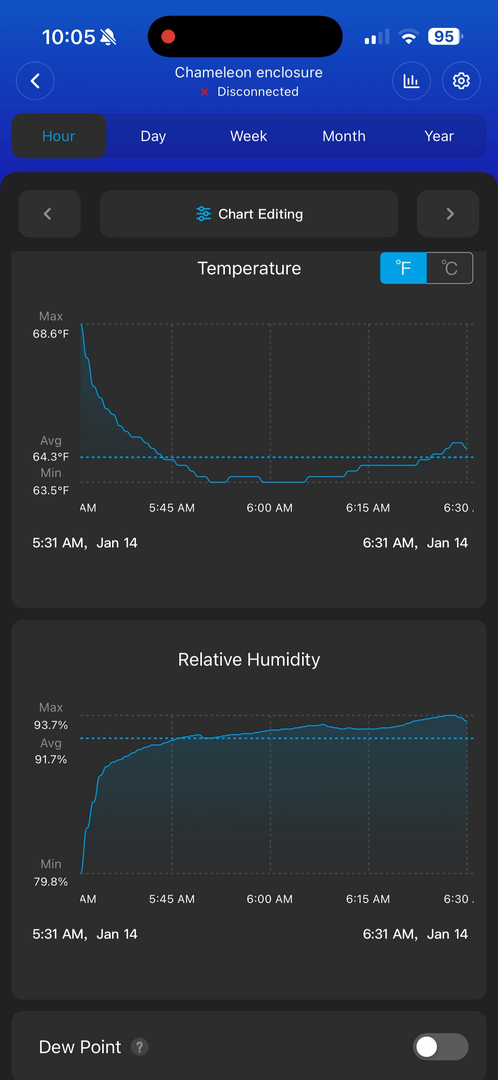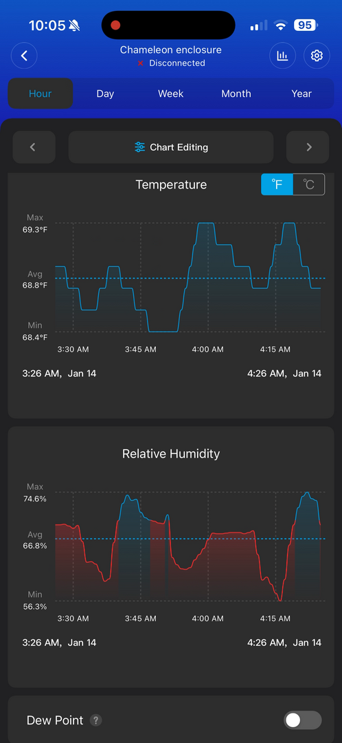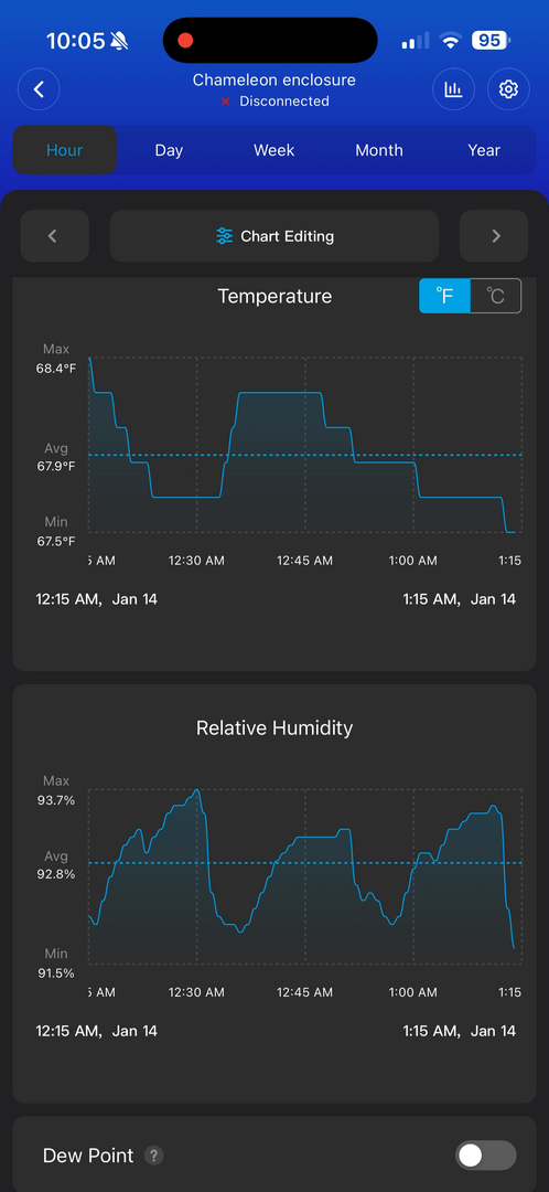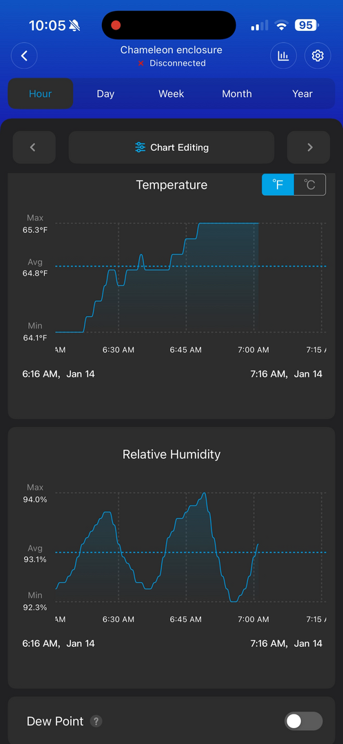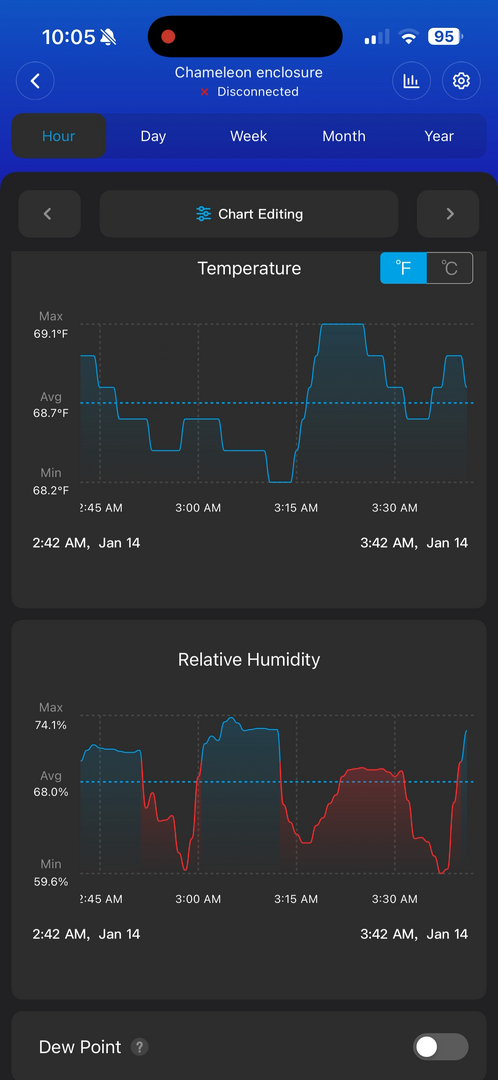 Trying to get my humidity levels dialed in before I receive my Cham at the end of this month. I attached screen recordings of the chart for temp and humidity. Misting is at 6:30a and 7:30p (30 min before lights turn on and after light turn off). Fogging all night after light turn off every 30 mins for 10mins.