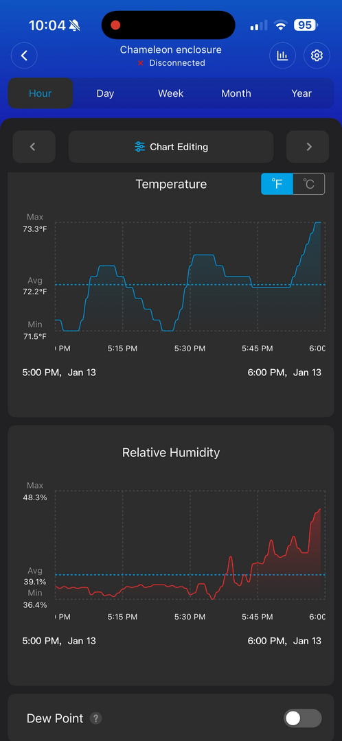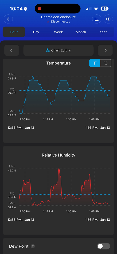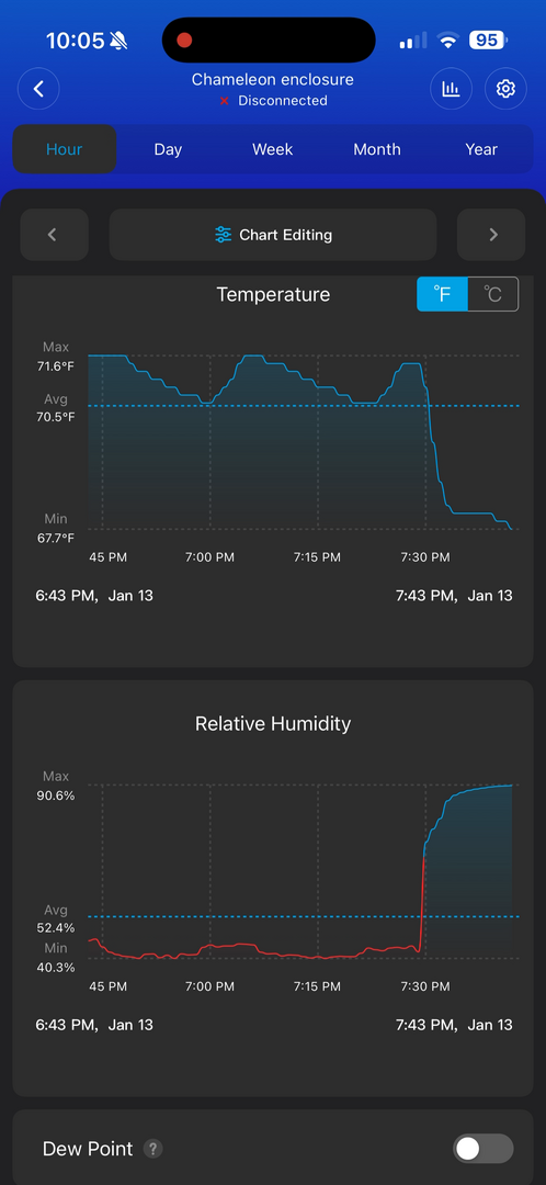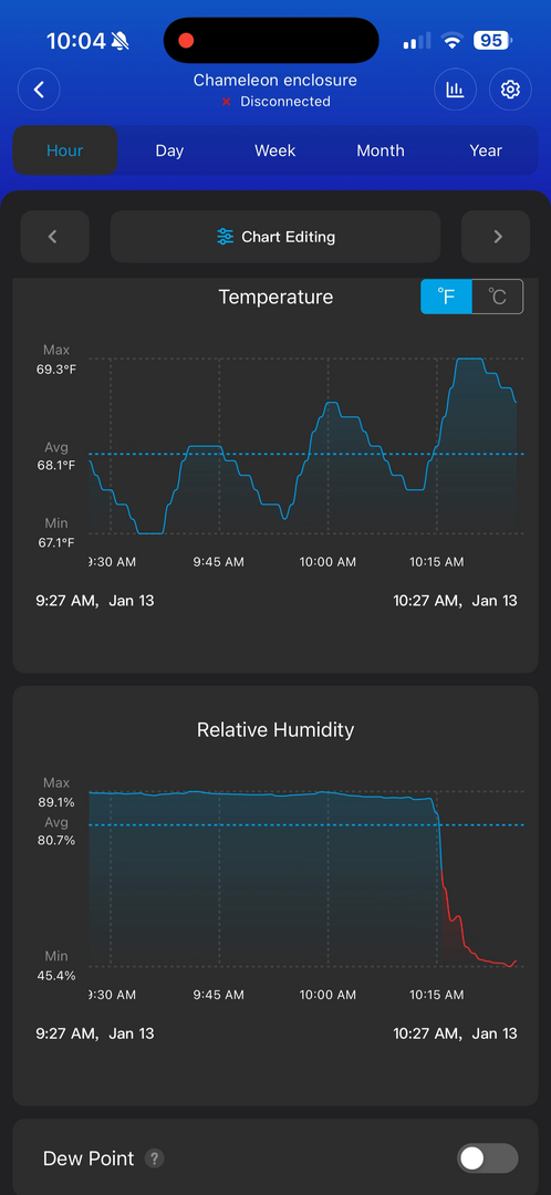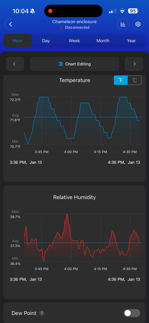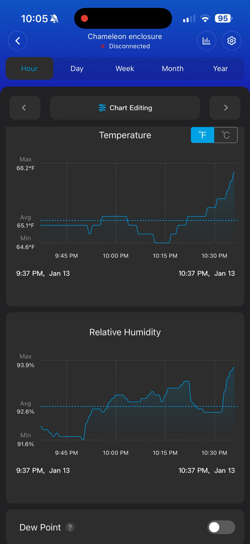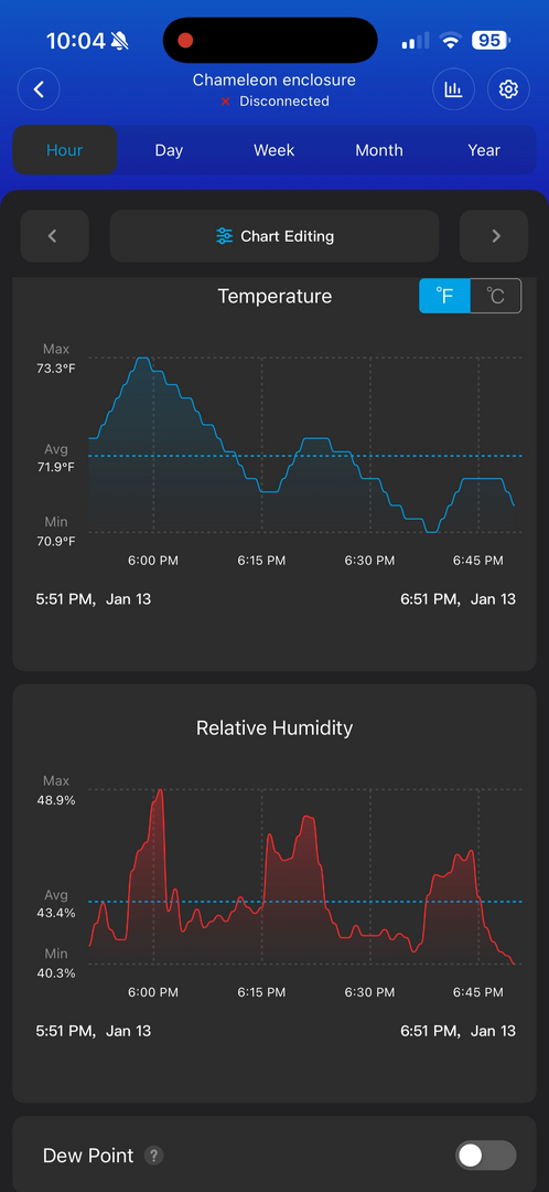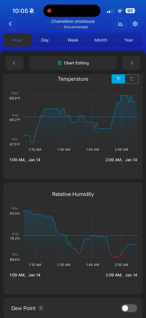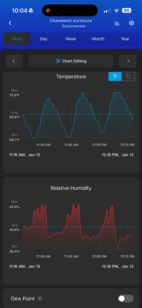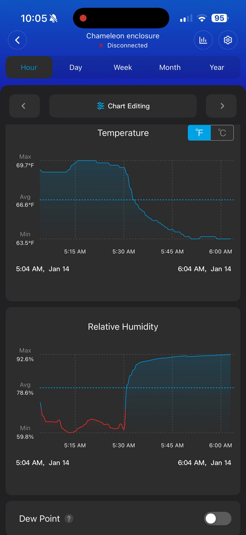 Trying to get my humidity levels dialed in before I receive my Cham at the end of this month. I attached screen recordings of the chart for temp and humidity. Misting is at 6:30a and 7:30p (30 min before lights turn on and after light turn off). Fogging all night after light turn off every 30 mins for 10mins.
