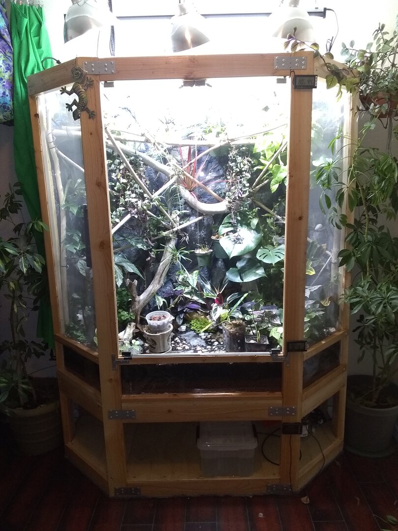 Cage Type - This is a homemade enclosure. Technically an irregular hexagon, but close to a rectangular 5’ x 2’ x 5’. Wood frame, foam + Drylok background, screen on two sides and on top, glass doors in front. The enclosure is bioactive and currently home to springtails, giant canyon isopods, and earthworms (thanks jamest0o0).