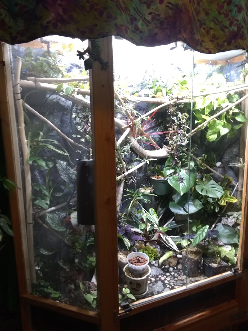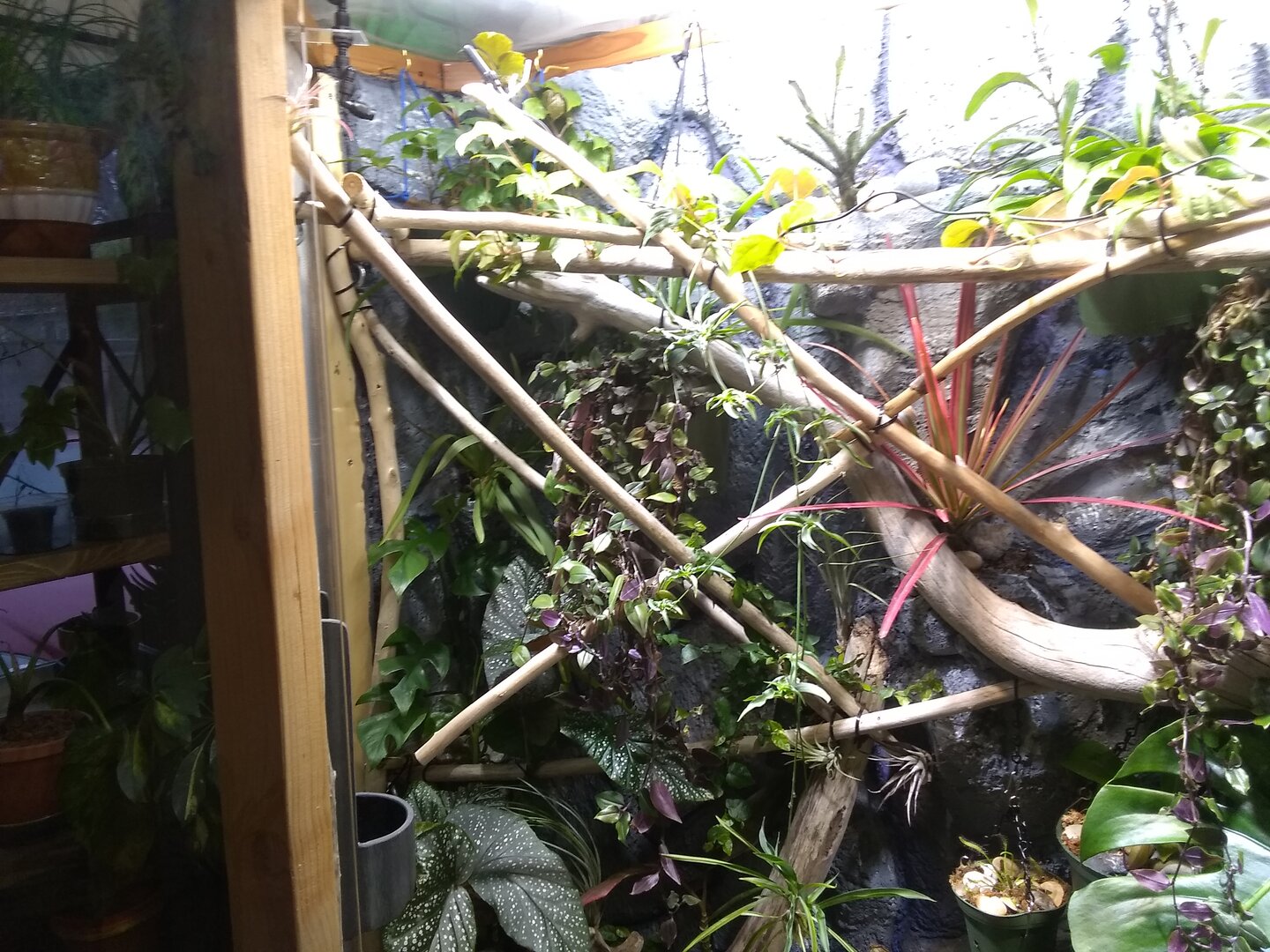 Humidity - The probe on the basking branch measures 40-45% during the day. The floor of the enclosure stays around 65%. The mister is timed to activate right before the lights turn on in the morning and plants are wet for about half an hour, then remain dry for the rest of the day.