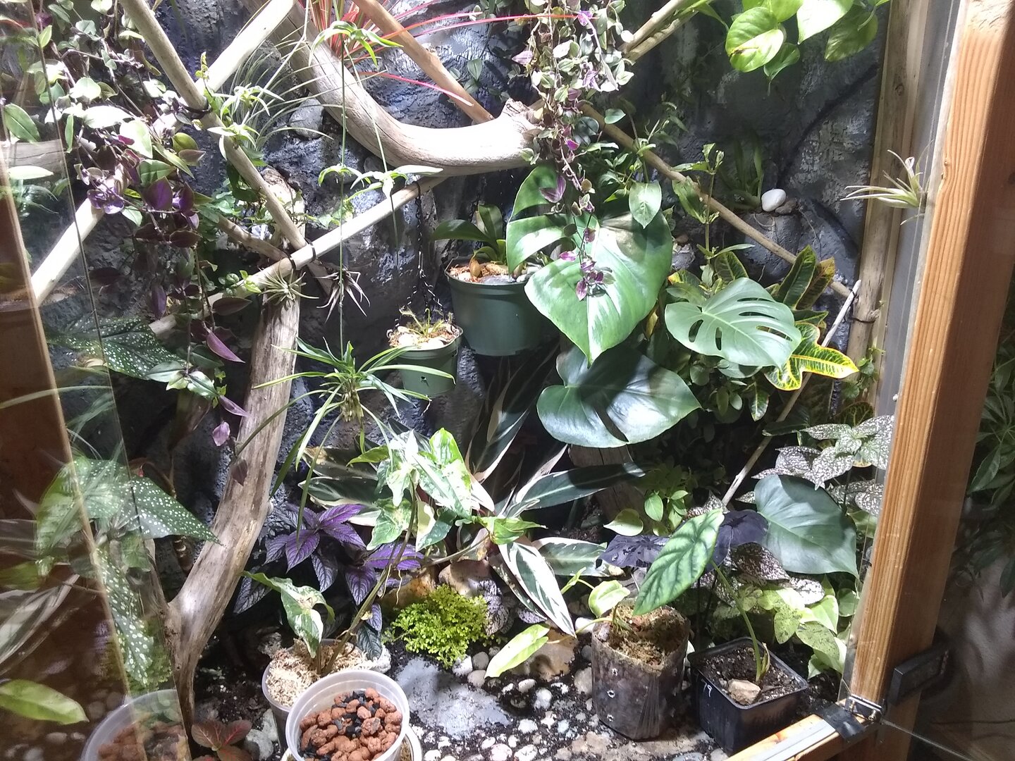 Plants - My partner is deep in the tropical houseplant hobby and we have jammed a lot of cool plants into the enclosure. There seems to be a lot of grey area about what plants are chameleon safe. My understanding is that since panther chameleons do not generally eat them, plants that are mildly toxic to ingest might still be suitable. That said, if there are any plants on my list that are dangerous, I would like to remove them before adding a chameleon.