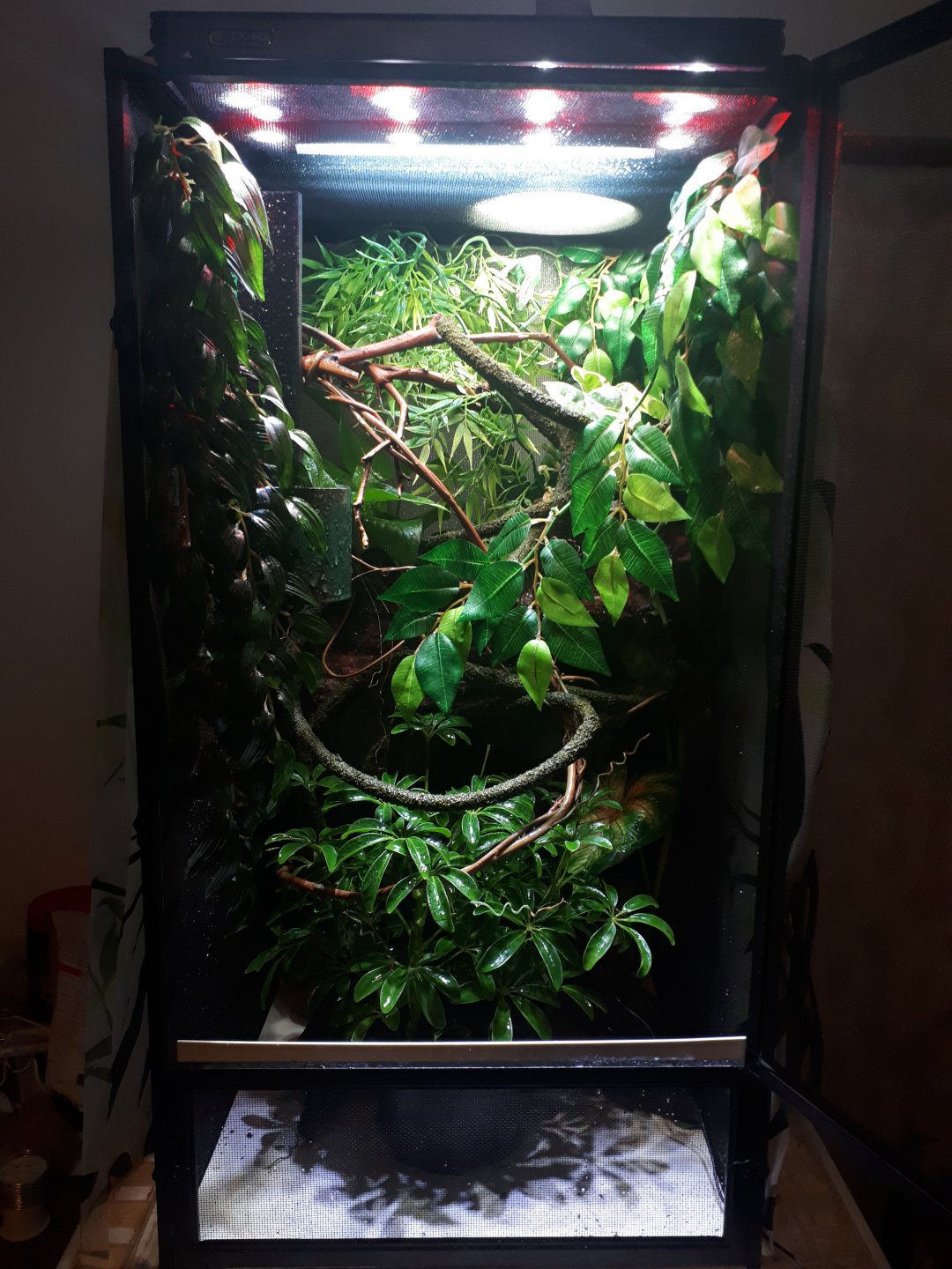Cage Type - Karma's current enclosure is a 16x16x30 medium ReptiBreeze screen terrarium. Due to current space restrictions, I plan on upgrading him to a 36x18x36 ExoTerra enclosure in the spring/early summer. Undecided if I want to get another screen enclosure or try a glass one. Ultimately I'd like to make a large custom build or purchase a Dragon Strand large clearside atrium when I have the space, but that probably won't be for awhile.