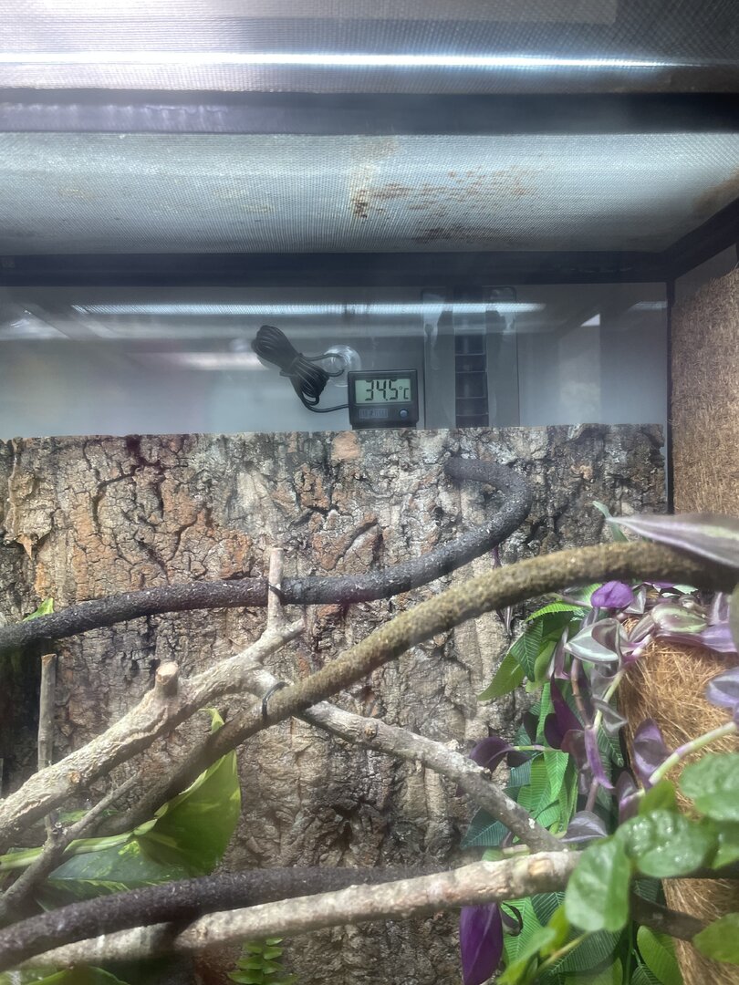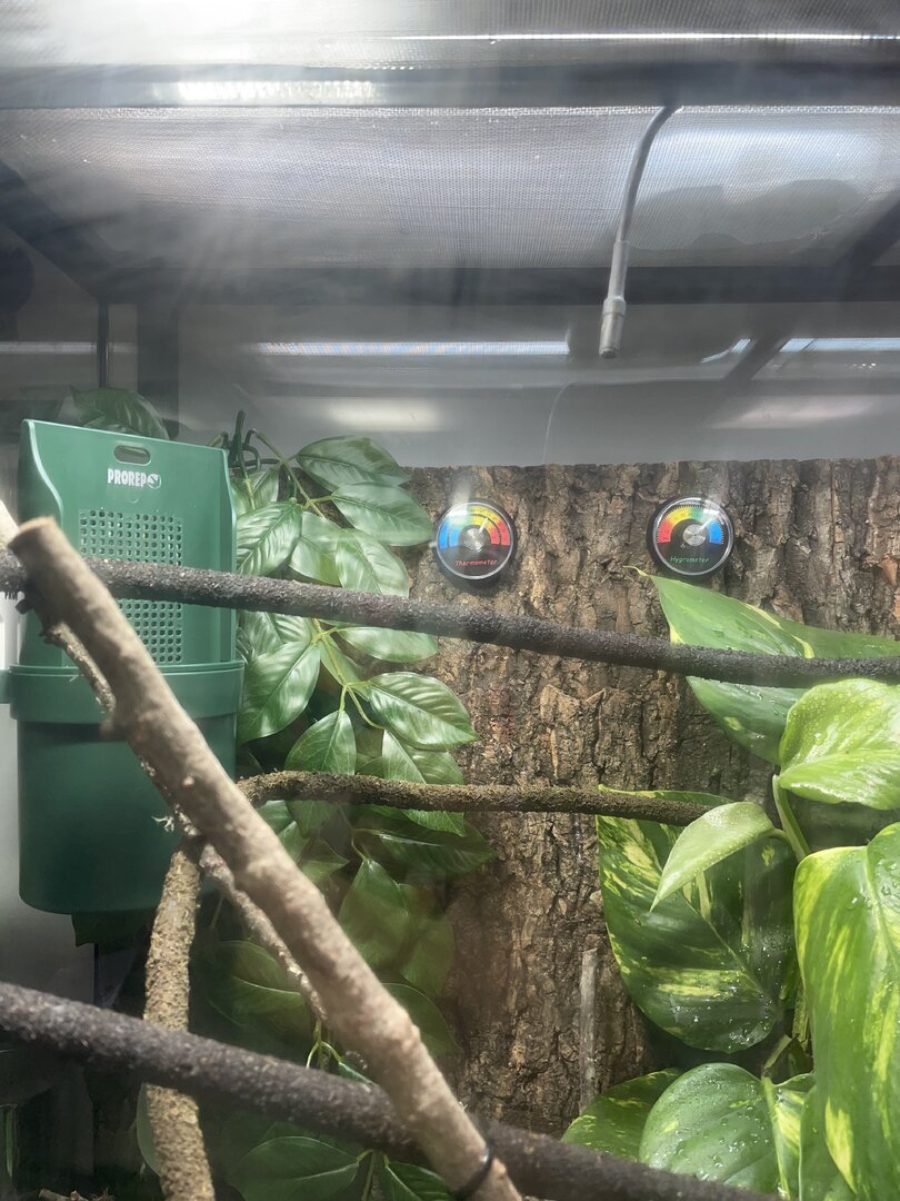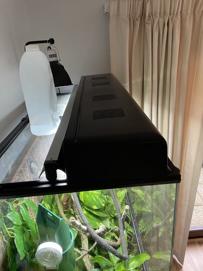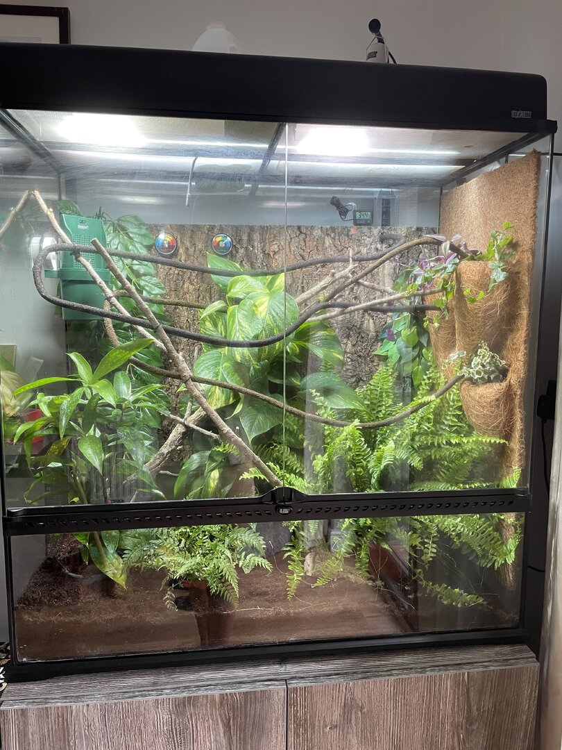 I’m from the uk and it’s colder so I’m using a glass enclosure to keep heat and humidity at the right temperature, the enclosure is the Exo Terra 90” x 90” x 45”.