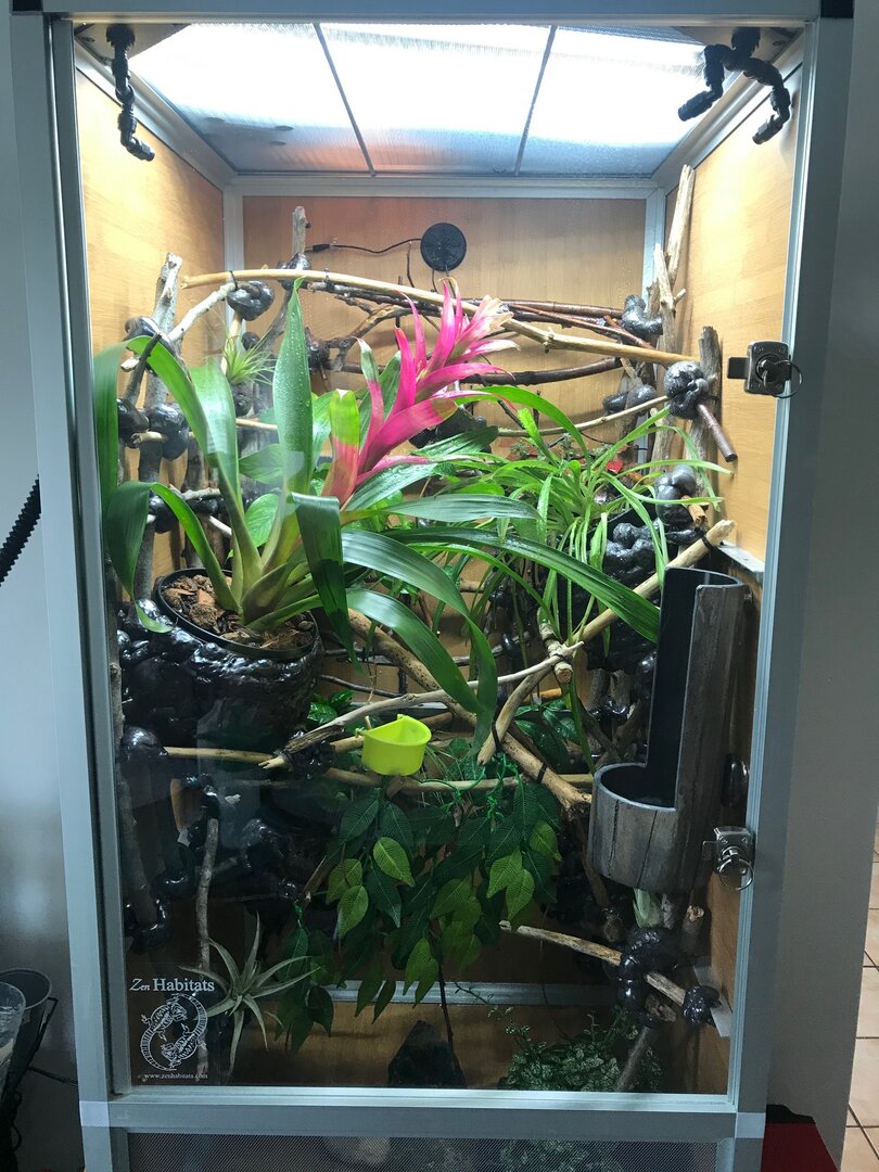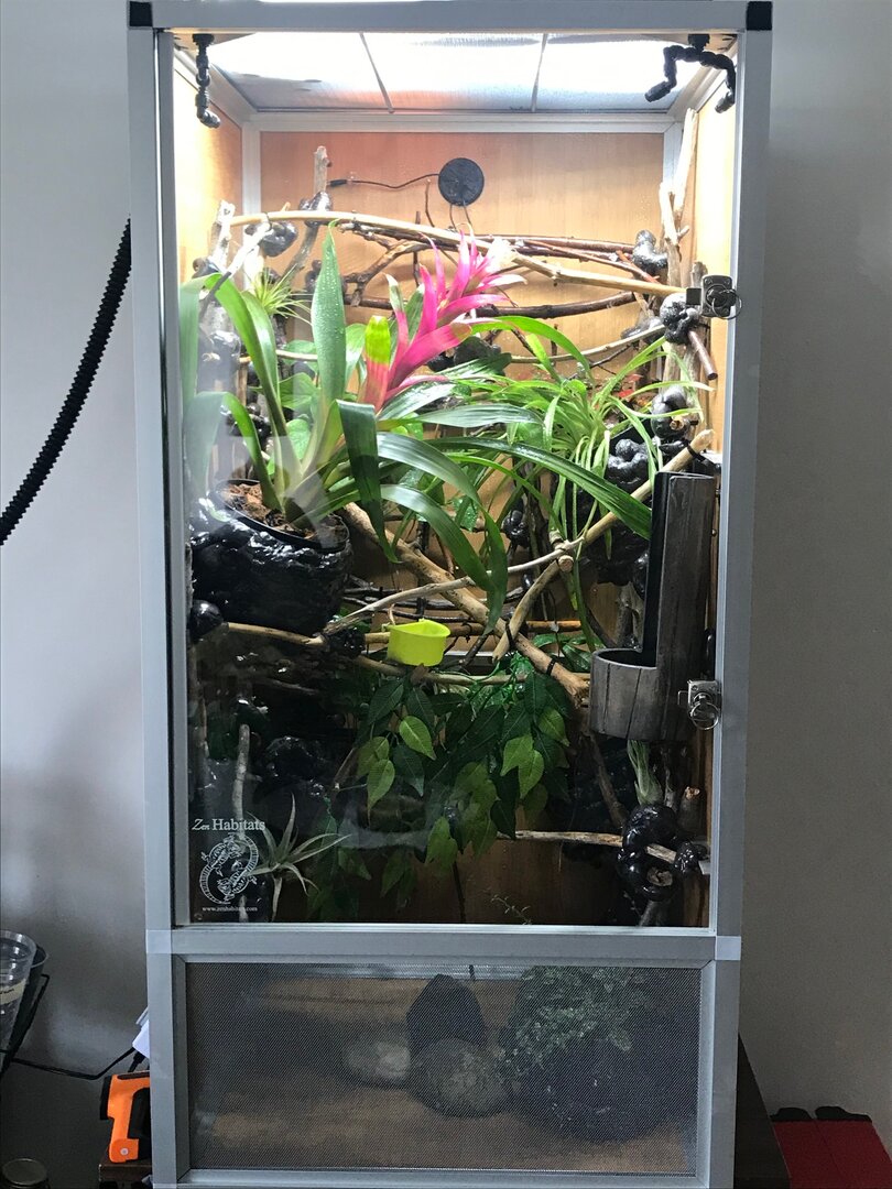 - Humidity – During the day, ~50% - 65%, with a spike around 80% after morning mist. Humidity is achieved through misting schedule and overnight fogging. I have a hygrometer for spot checking and a ZooMed digital combo meter inside the cage. Night time is around 80% after lights out mist, and 65% prior to me going to bed (10 p.m.) but I try to bump it close to 100% overnight with the 1 a.m. mist and fogging.