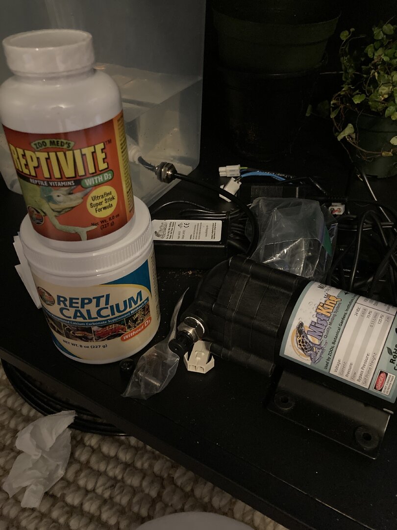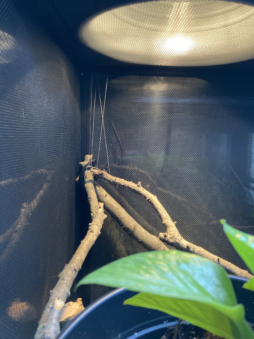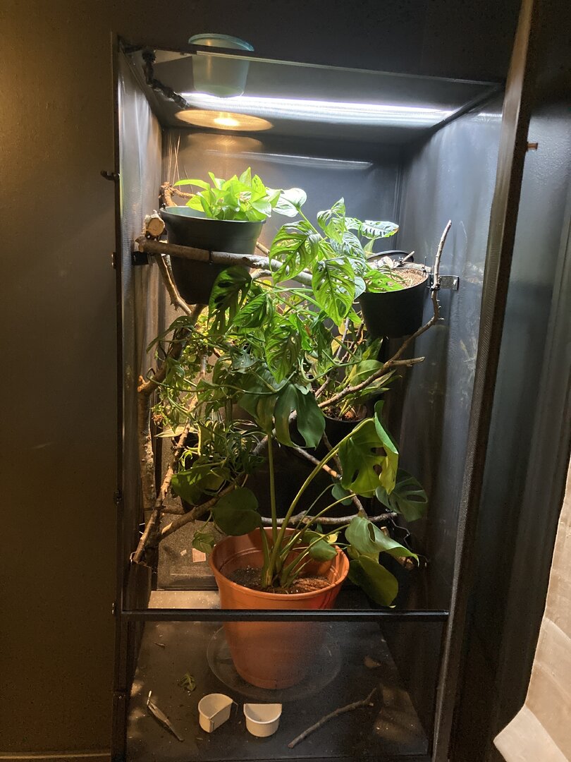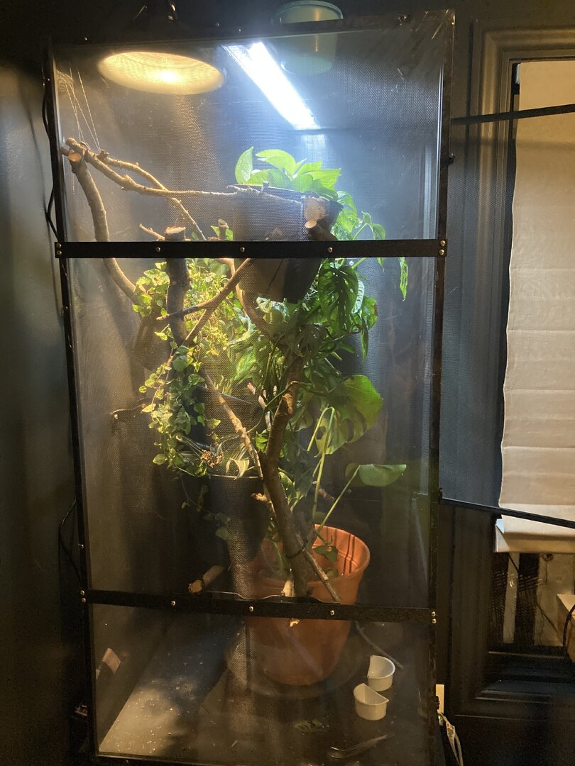 Ok so I am getting a new ambilobe panther chameleon on Wednesday of next week and I wanted to make sure that my cage looks good and make sure it will provide the hides and environment he needs. On top I have a 24” T5HO 5.0 Reptisun hood along with a Zilla deep dome heat lamp w/ a 50 W bulb. The basking temp is around 80-82 degrees. I will post a couple pics of the cage, but it is a ReptiBreeze XL cage with dragon ledges. I have lots of sticks and branches attached with sticks, but the basking branch is also supported with a bit of fishing line. Is this ok? I have 8 plants including a monstera, a Dracaena white jewel, a creeping fig (which I have 2 if I need but only one is in the enclosure), a jade Pothos, a philodendron brasil, a aglaonema emerald beauty, and a philodendron Swiss cheese. I have a Mistking misting system that is set to go off a 7:30 am and 7:30 pm with lights turning on/off at 8:00am and 8:00pm. For supplements I will use the repti calcium without d3 every feeding and the reptivite on the 1st and 15th of each month. Hopefully this all makes sense! Thanks!