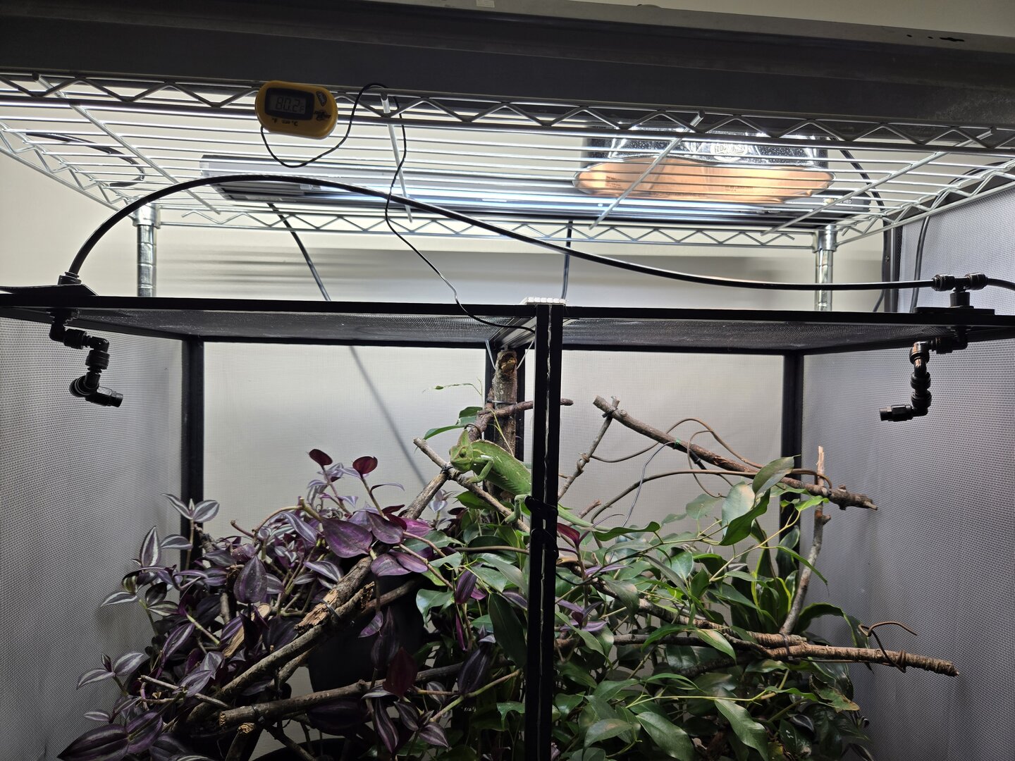 - Temperature - I have digital thermometers with probes, one is zip ties to her basking branch (most days it's 80-80.5 F, but it's getting colder here lately so the temp is slightly lower some days while I get the indoor temps more evened out) and another is placed on the opposite end within the lower branches, it usually is 72-74 F.
