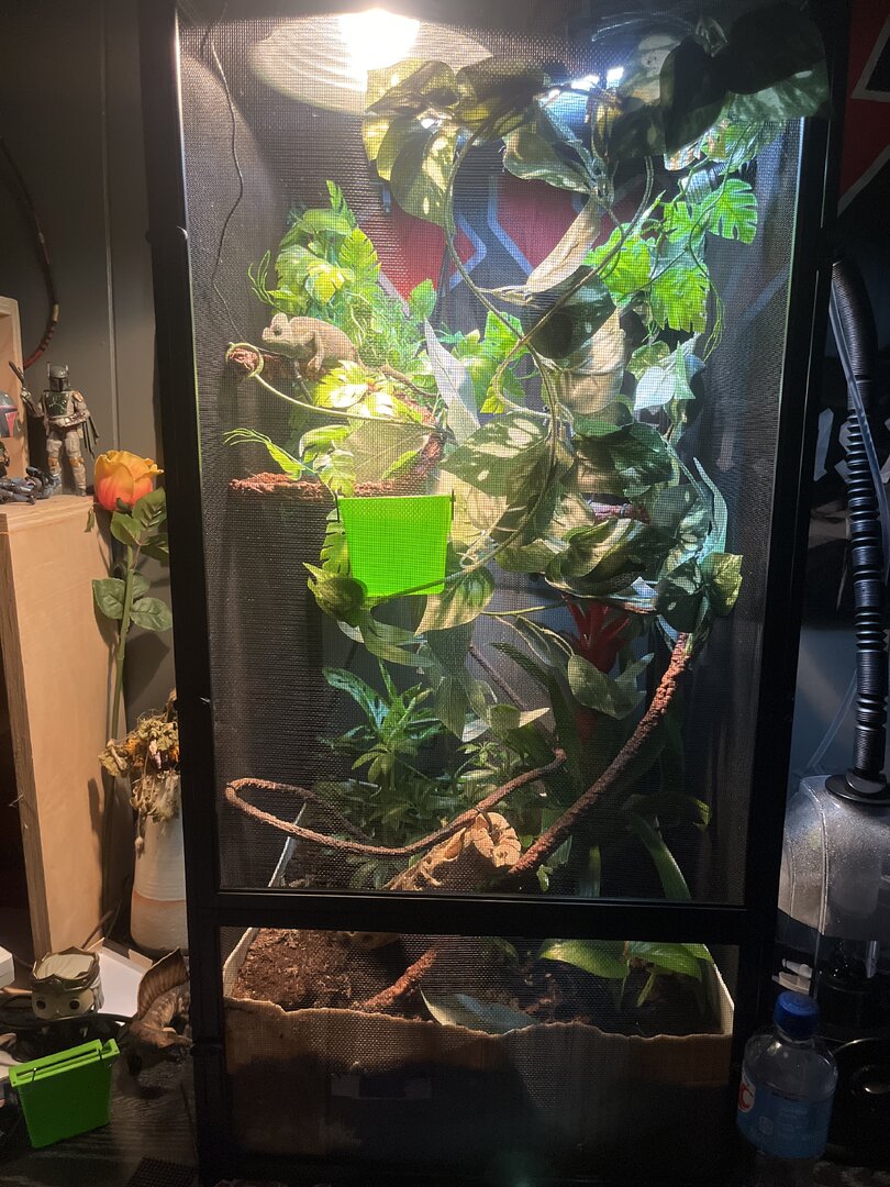 So this is my first time owning a chameleon or reptile in general which trust me I know is a bad idea to start with now. But so far I think everything is going ok, poured hours and hours into research about everything I need for her. I know the basics, high cage, temp needed, humidity, lay bin. If anyone would be willing to help rate my cage and everything that would be great to just get a second opinion!