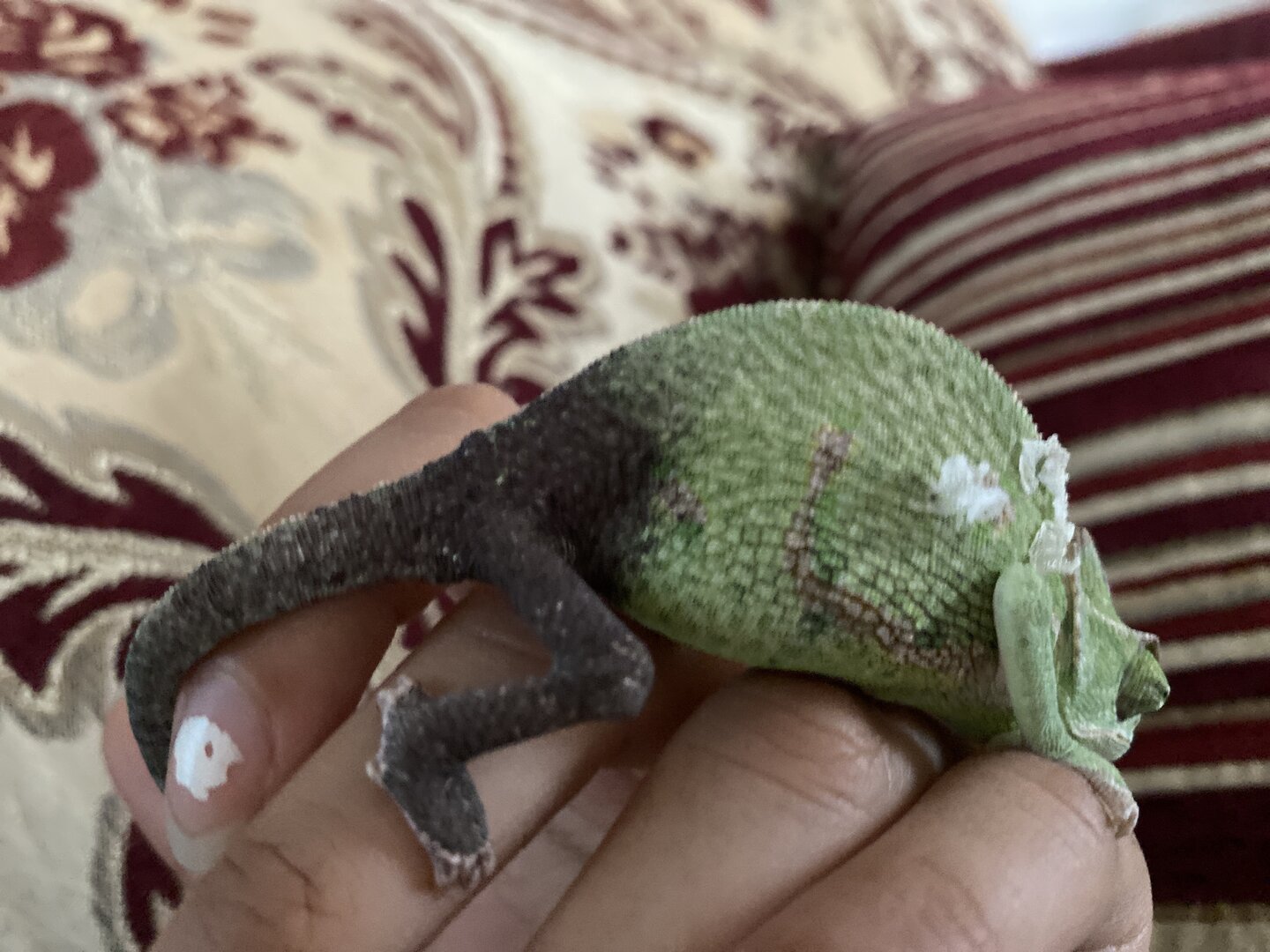 Hello, about a hour ago i was walking around my room and suddenly feel a small body underneath my feet. I quickly stepped away, and saw that my chameleon had escaped his enclosure and is now a dark brown color, flat on the ground. I feel horrible. He got back up, started turning green again within 20 minutes, his grip is a bit weaker and he seems to be lower. There are no vets nearby and I am extremely concerned with his health. His right and entire lower body (leg to end of tail) has turned dark brown. Although, it still curls and preforms normal functions. He seems weak. Please help.