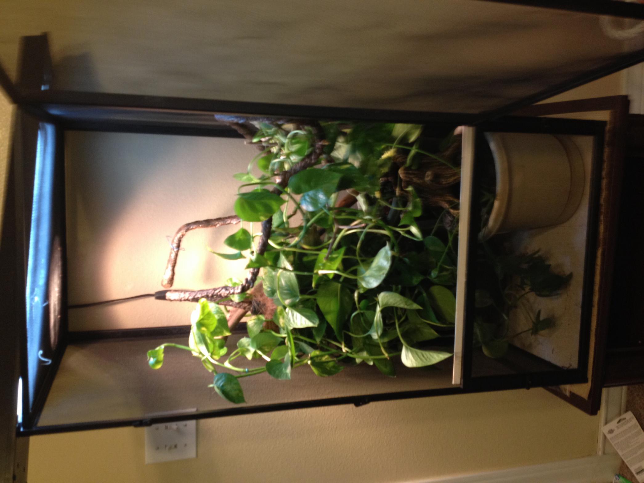 You need many more climbing sticks, esp. near the top of the cage. Then just pull some of your vines upward. Chameleons like to be at the top of the cage.