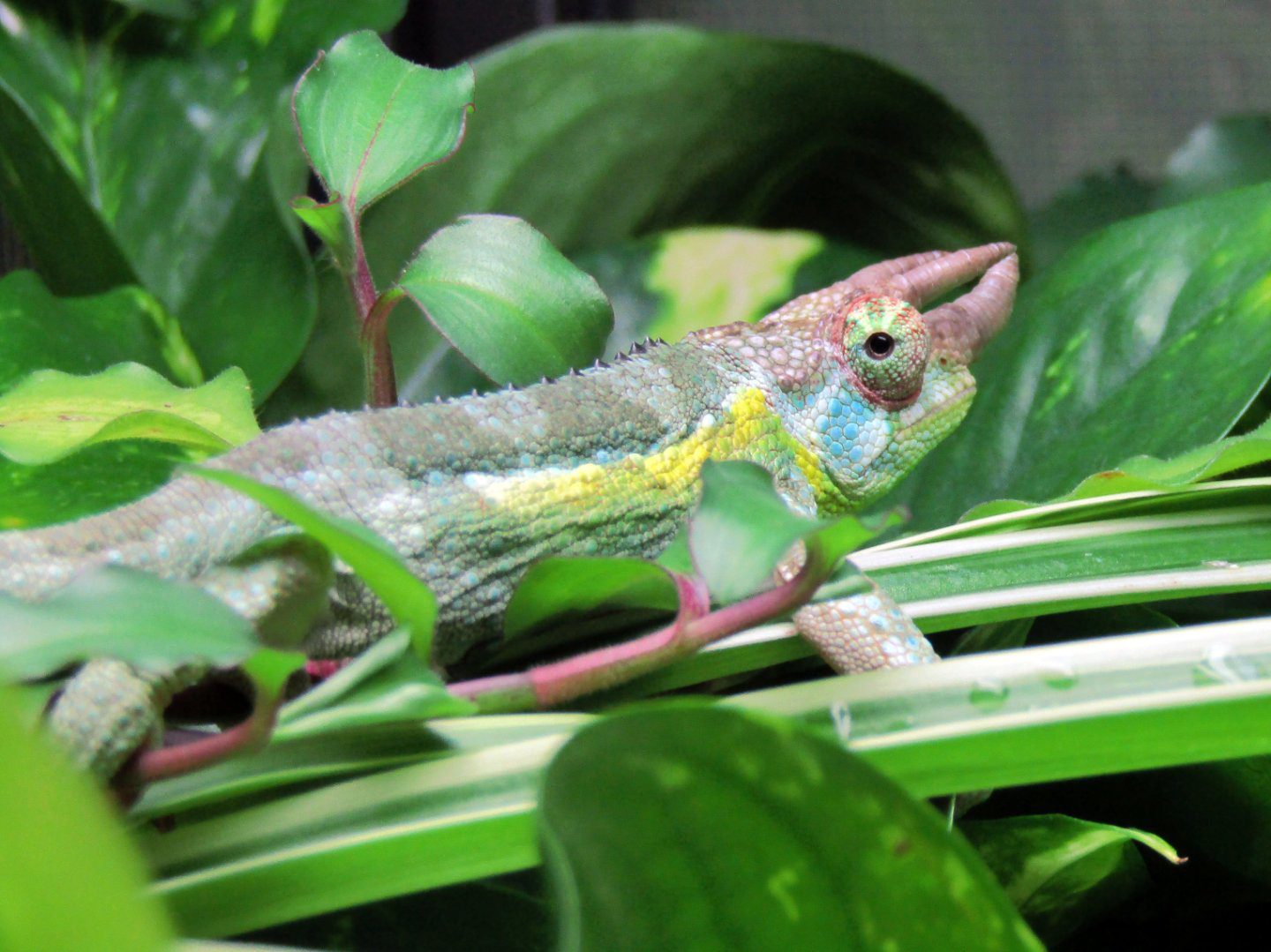 So he's coming on 4 months this month and I went and looked at jackson chameleons that were 4-5 months old and they are huge and completely green and have big horns, and mine is small and still is Brown and his horns are tiny, could he be a dwarf? Please (second photo is him as of today)