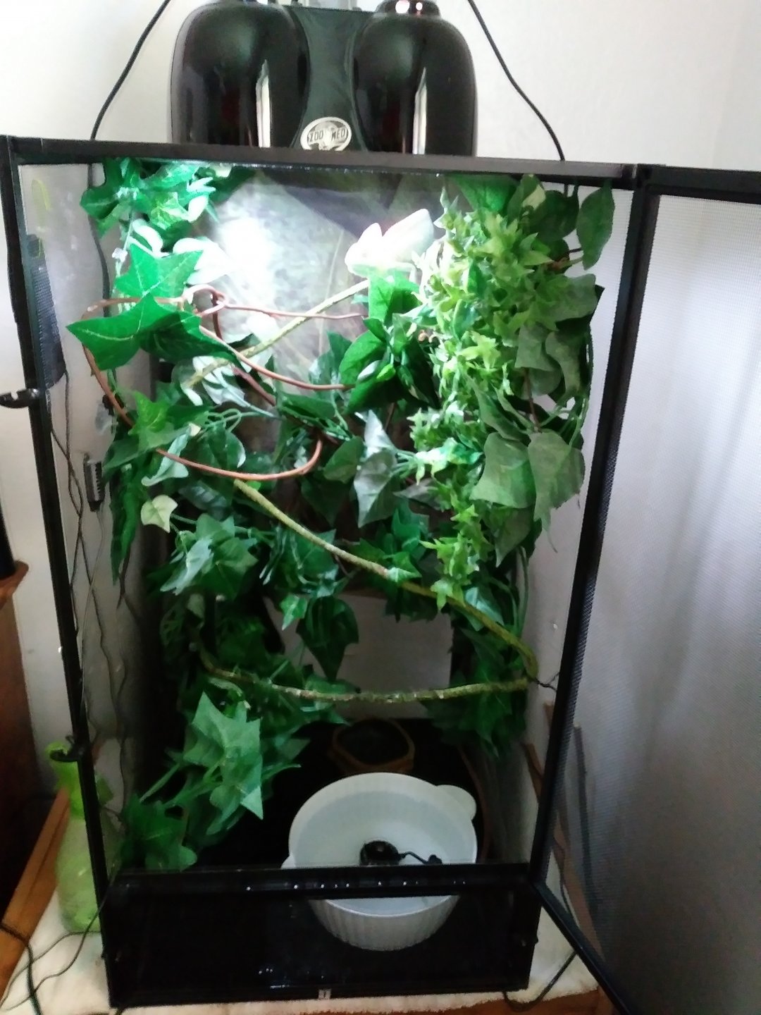 So this is my first time taking care of a chameleon. And think im doing a good job at it I got a screen cage with lots of coverage and vines I got the bio bubble drinking fountain i got everything I need. The only thing I'm having problems with bus the flooring and my mist maker it sparys water everywhere makong it to wet in the cage I know the there a way to set it up with it making a big mess if anyone cam help that would be great I know i need to get some real plants. Also so thank you