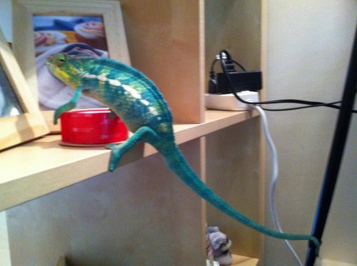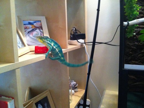 I have attached a picture from yesterday of Ernie as he goes on a little adventure in my room.. this is the first time he has really shown bright blue colours. I never handle him and take him out of his cage when I'm in my room, I simply leave the door open and give him the choice to come out if he wishes. Apologies for the poor picture quality, I took them on my iPhone. Is there anything you see that is ringing any bells?