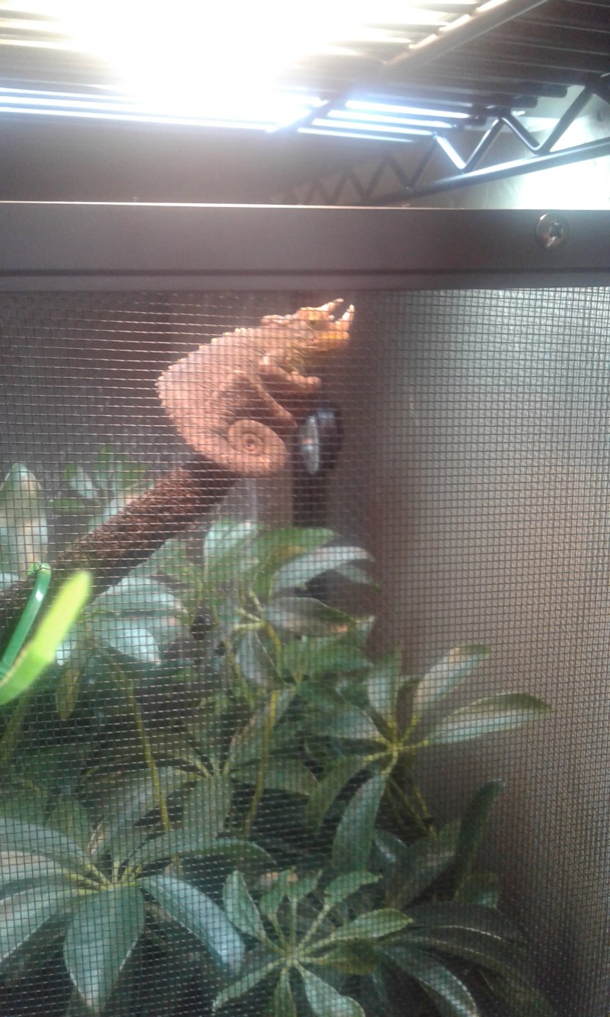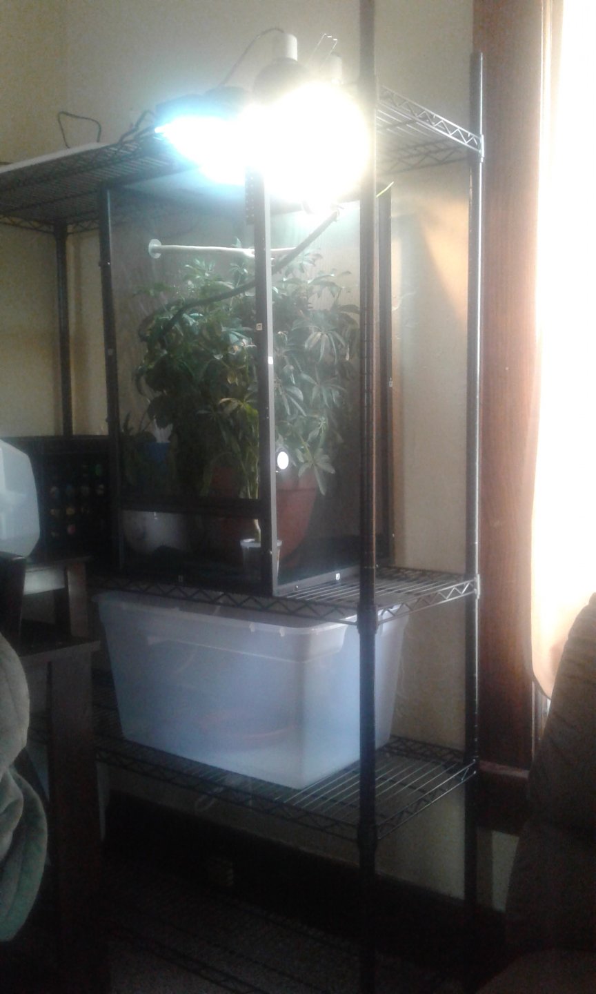 On saturday I had to look for a way to fix the issue. Had a temp fix and found an idea on here using a shelving unit. Yesturday i took him out of his cage to fix the drainage system and also swapped his blue daylight bulb for the white as it was recommended on here.