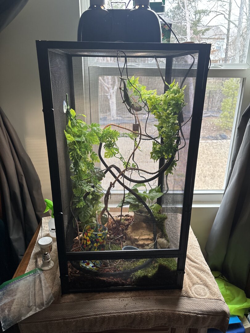 Ok so the m new to chameleons and this is my first one. I have a veiled chameleon and idk what to do about the light and I’m afraid of it getting heat burn. So basically I know they’re supposed to be 6inches away from the heater lights but mine just crawls all the way up on the walls (they’re not glass btw) and will hung right under them. So what I did was put vines for it to sit under the land. I have two lights and one is 40w and the other is 60w. If the chameleon was 6in away from the light the temp would be around 70, but where it is and likes to stay right now it can reach up to 78 (also no I don’t have a humidifier or digger yet so all I can do right now is mist three times a day if even). So is there anything I can do to keep him away from being so close to the light?