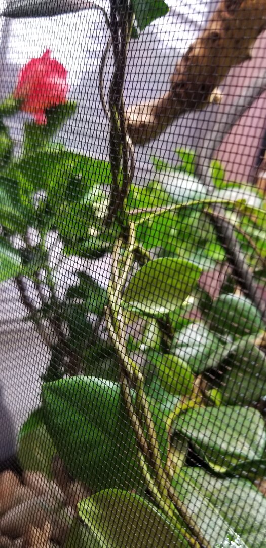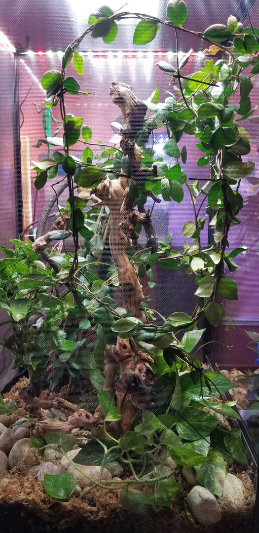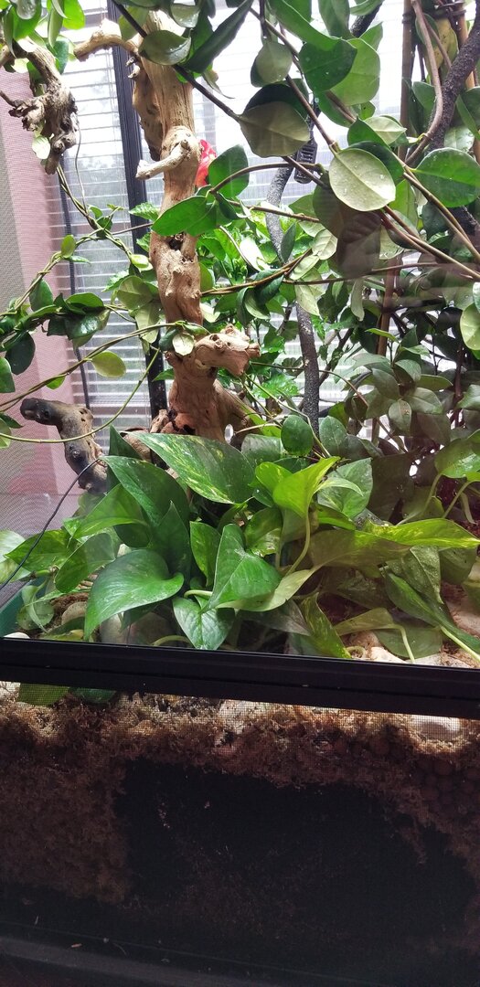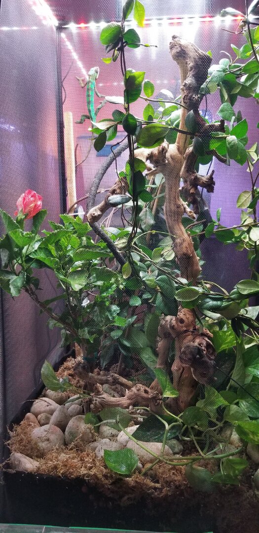 I read something yesterday about how the sap of a Ficus tree is toxic to Chams so I decided to take mine out and replace it with a Star Jasmine and Hibiscus tree. The bottom is lined with my Queen Pathos.