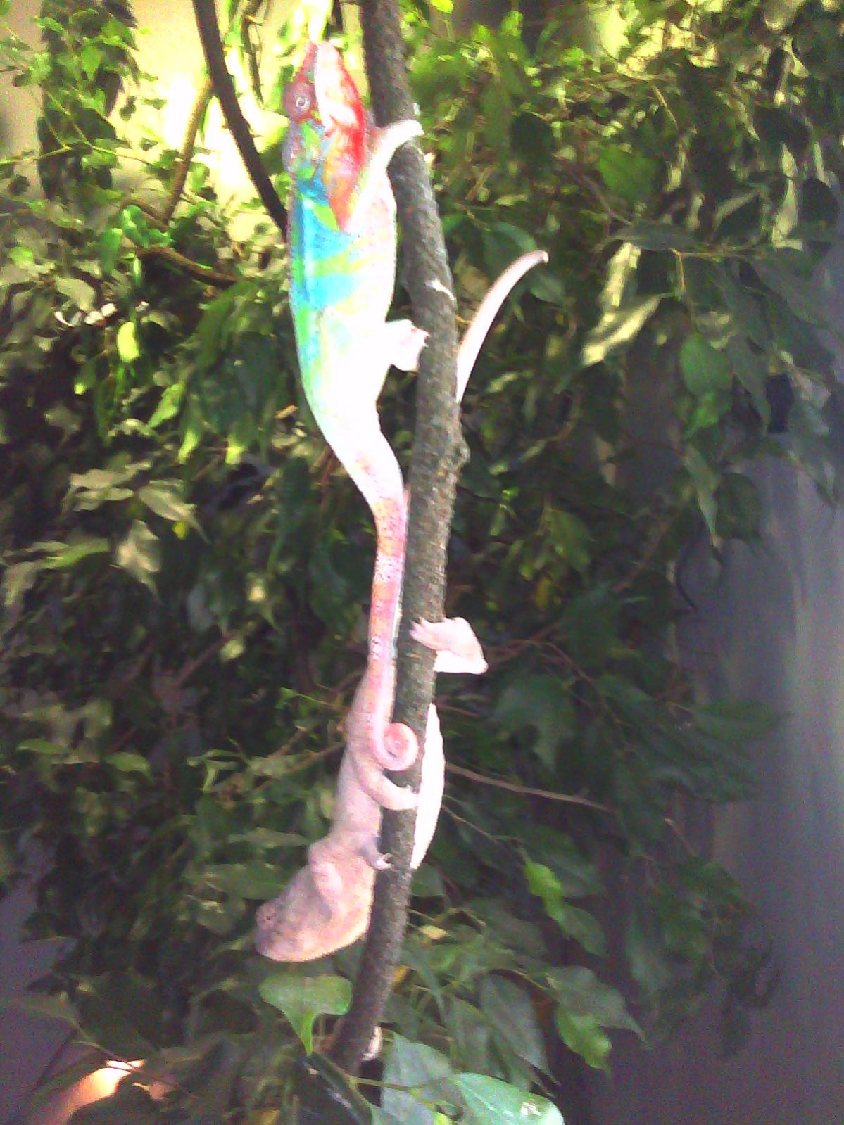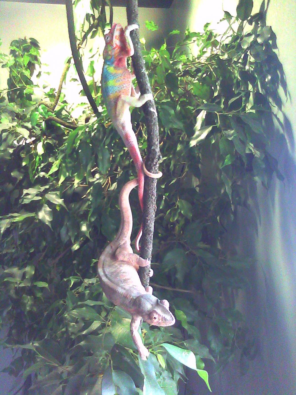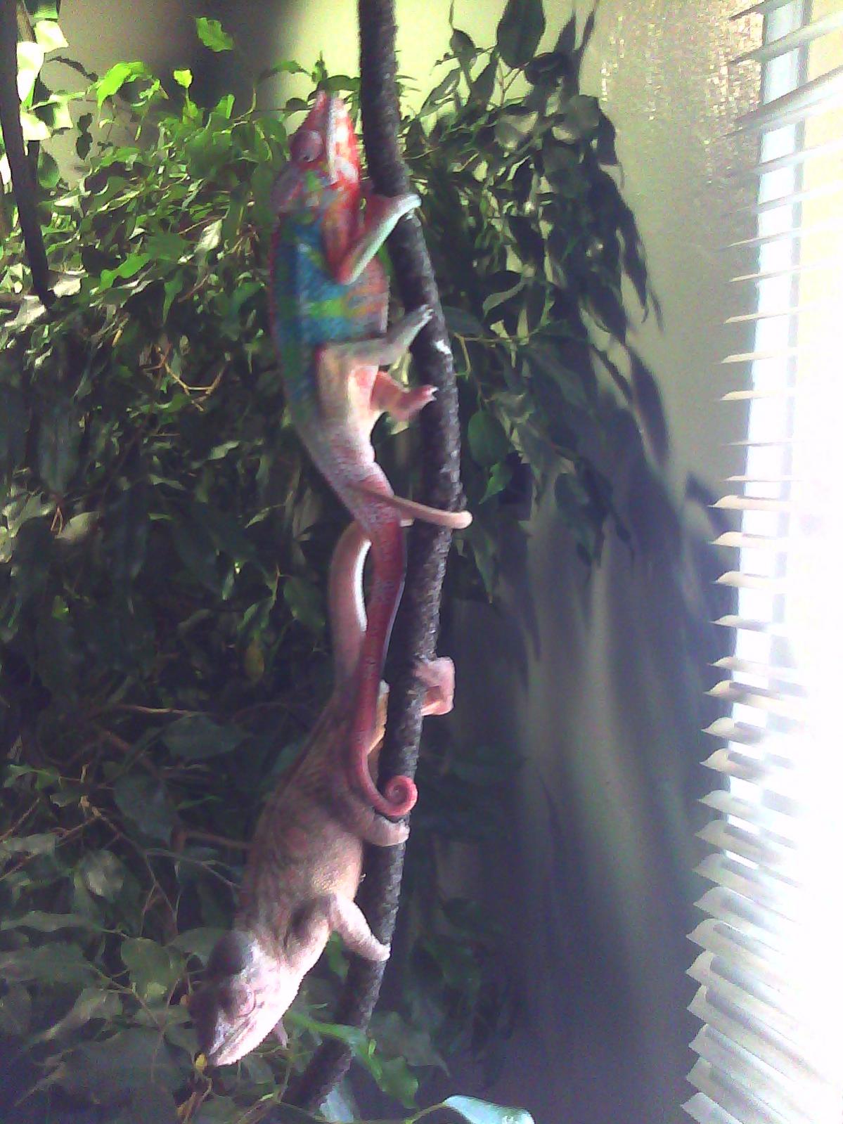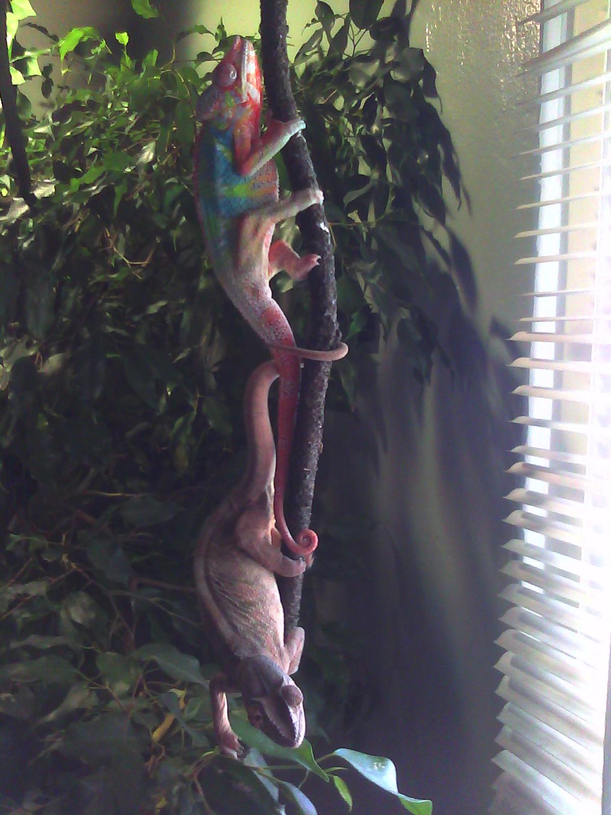 so i caught my lovers chillen together again..and thought ied take a pic of them and a vid before they see me looking at them..its gixxer and marcella..for some reason they are both the most friendly chameleons i have seen/had..ive yet to see them pester eachother or be aggresive towards one another (im here 98.9 percent of the time, and offer full supervision)..they have been seen literally sleeping together, snuggled up even..weird..they must really love eachother!!
